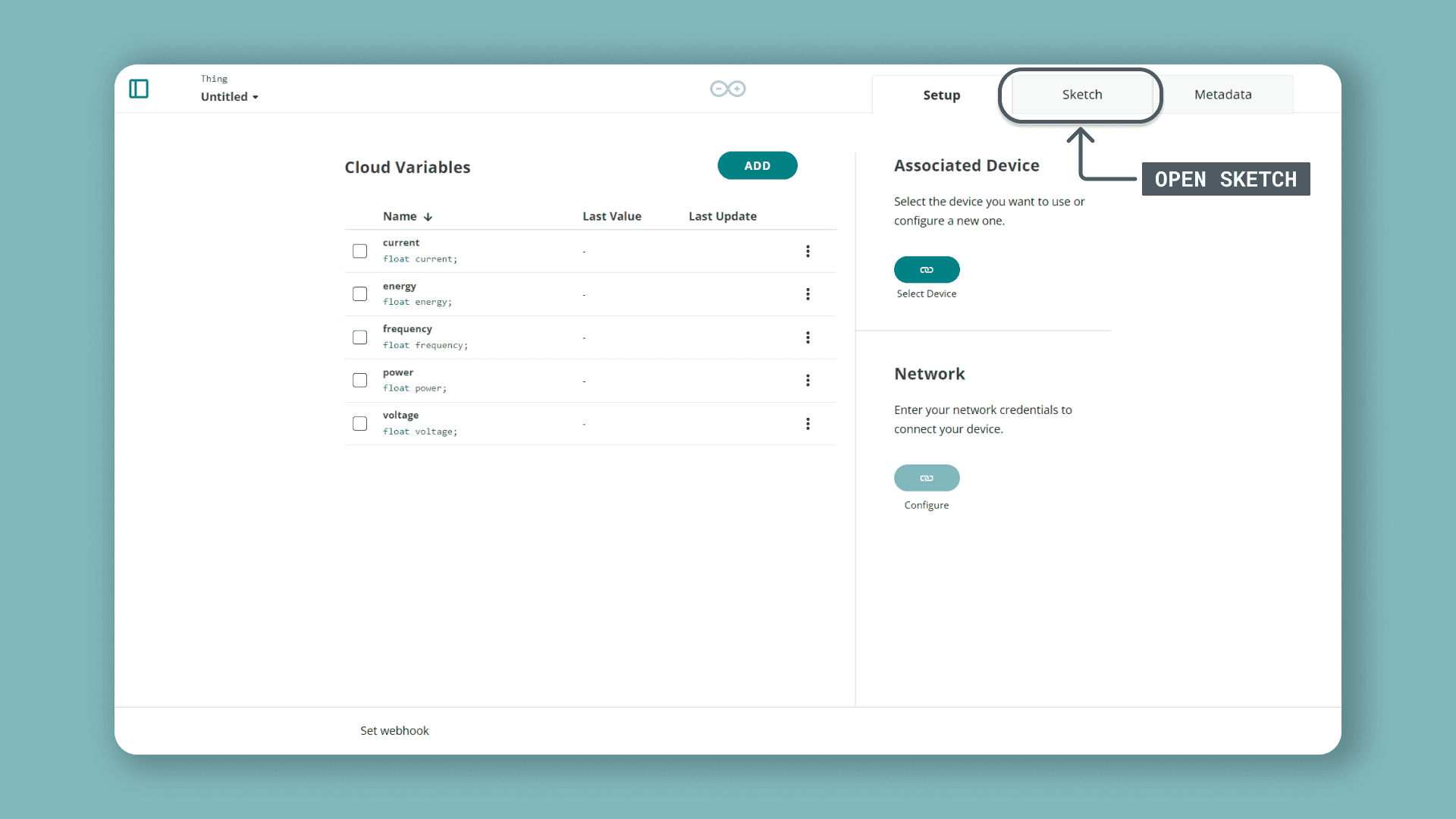 Once we are finished with all the configurations of the "Energy Thing", we can move on to creating the sketch that we are going to upload to our MKR WiFi 1010 board. To do so, we first need to go to the "Sketch" tab. But before, let's talk about Modbus.