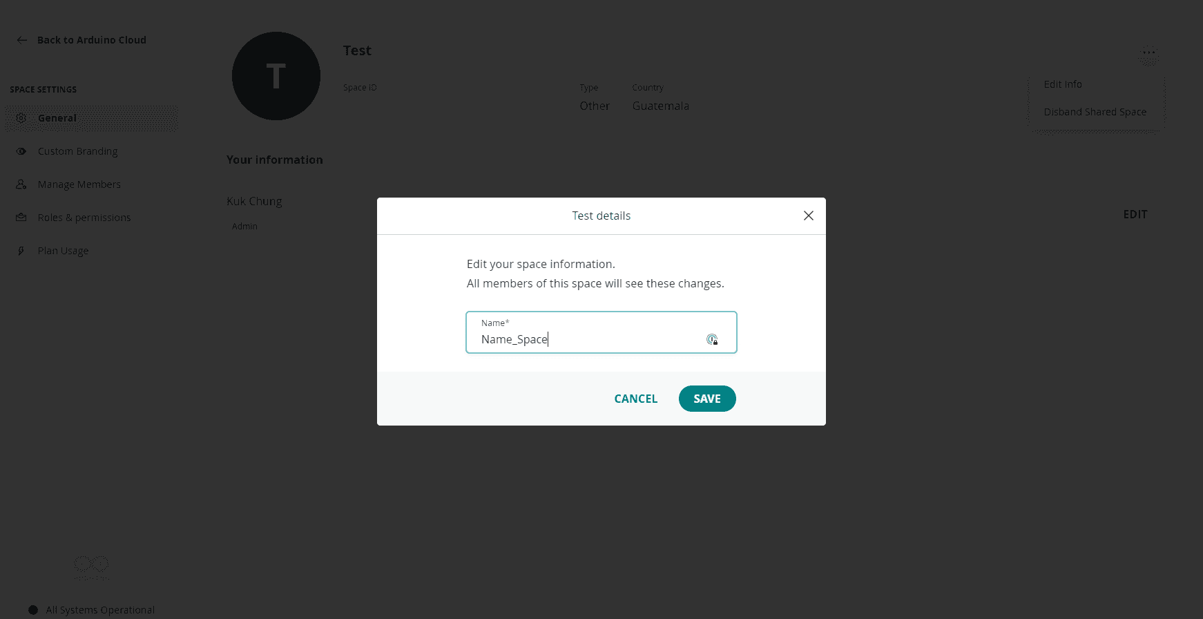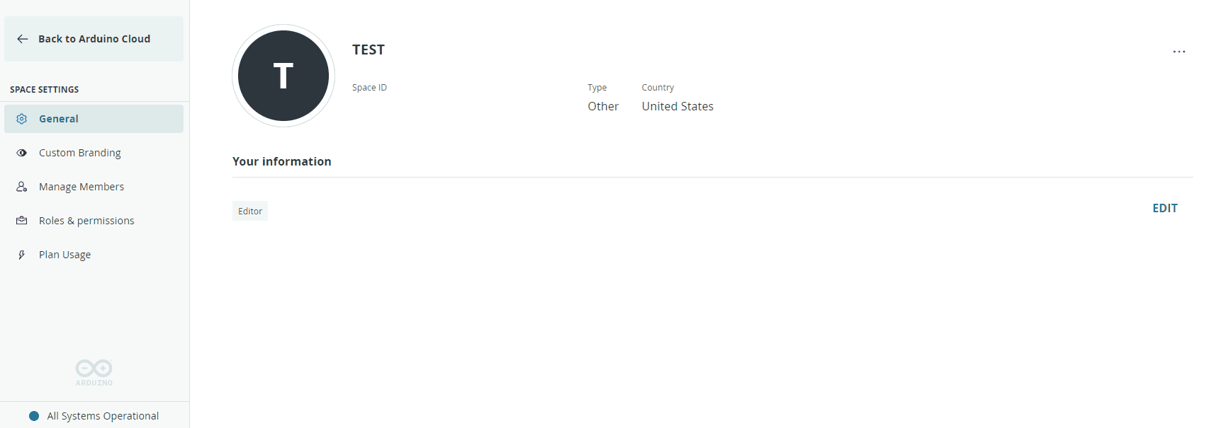 Arduino Cloud > Space Settings > General and clicking on Edit Info within the three dots located at the top right side.Your Arduino Cloud for Business plan comes with two spaces by default:
