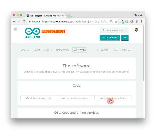 Once you are done with the Story and the previous fields go to the Software tab. In the ‘Code’ section, click on ‘Link to the Arduino Web Editor’ or ‘Link Existing Repository’.