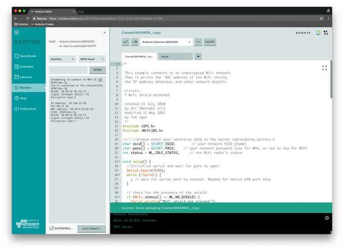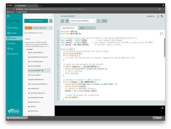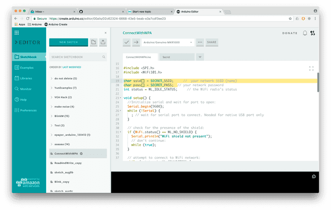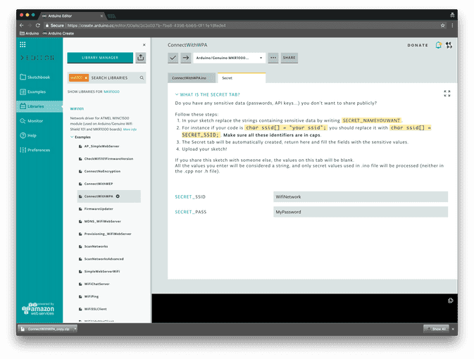 SECRET_SIID and SECRET_PSW. If you now click on the tab called “Secret,” you will notice some input fields where you can fill in your data.If you have a MKR1000 lying around, you can upload this sketch on it and watch your board connect to Internet (just make sure you join a 2GHz WiFi network).