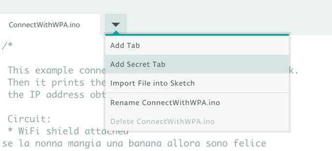 SECRET_SOMETHING in your sketch and save it, we will create a Secret tab for you to fill out.Let’s start with an example, just so you can see how it works.