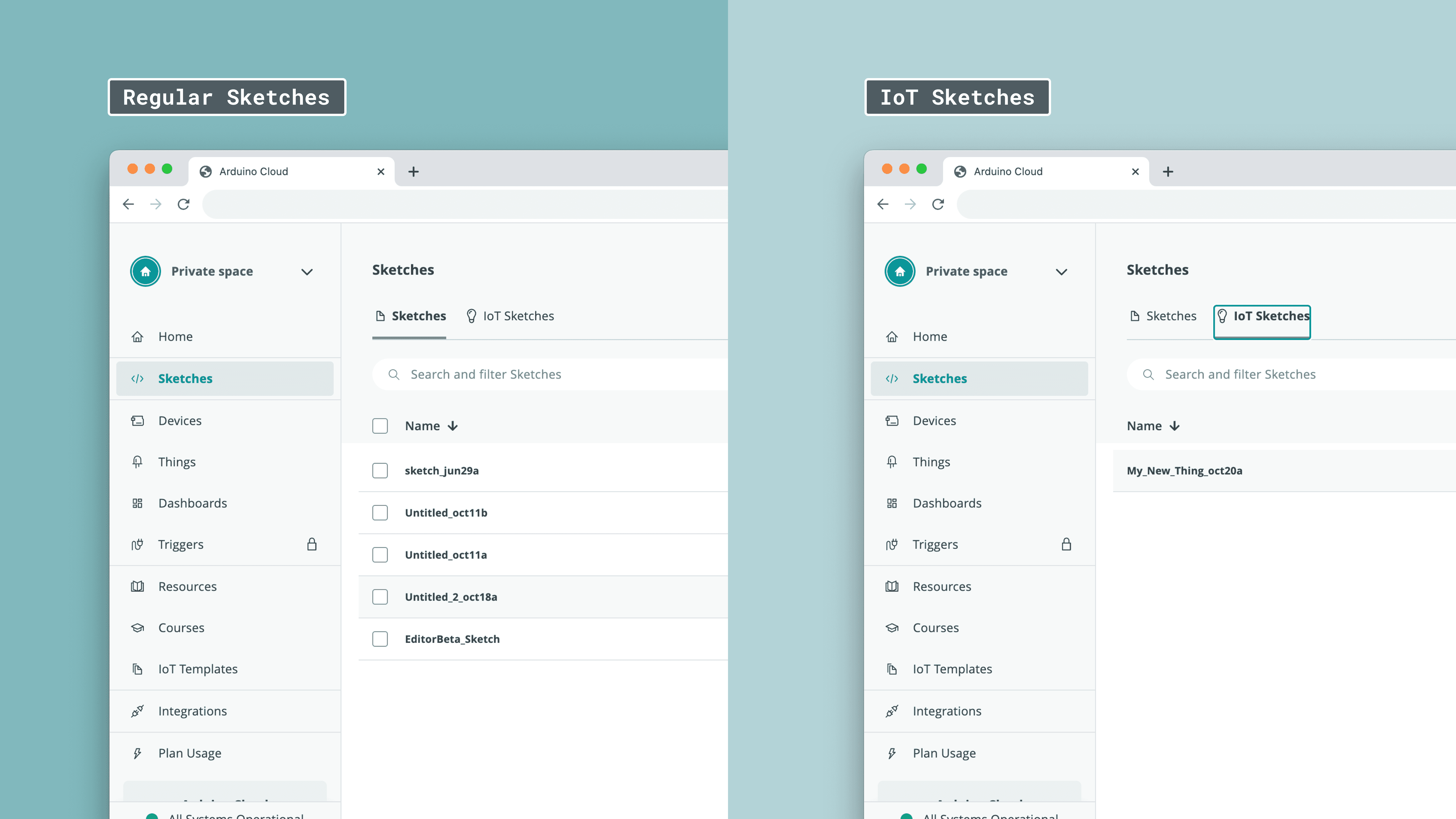 You can access all your sketches at app.arduino.cc/sketches, where you can easily select between your regular sketches and IoT sketches.
