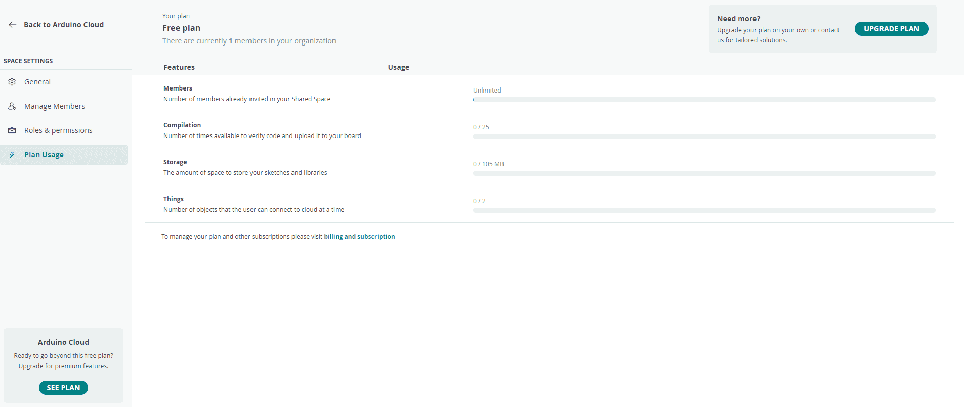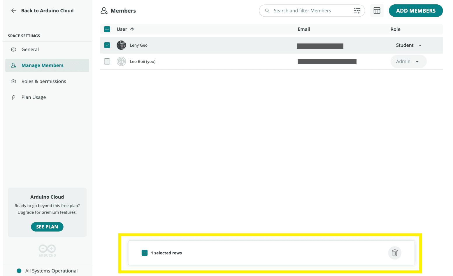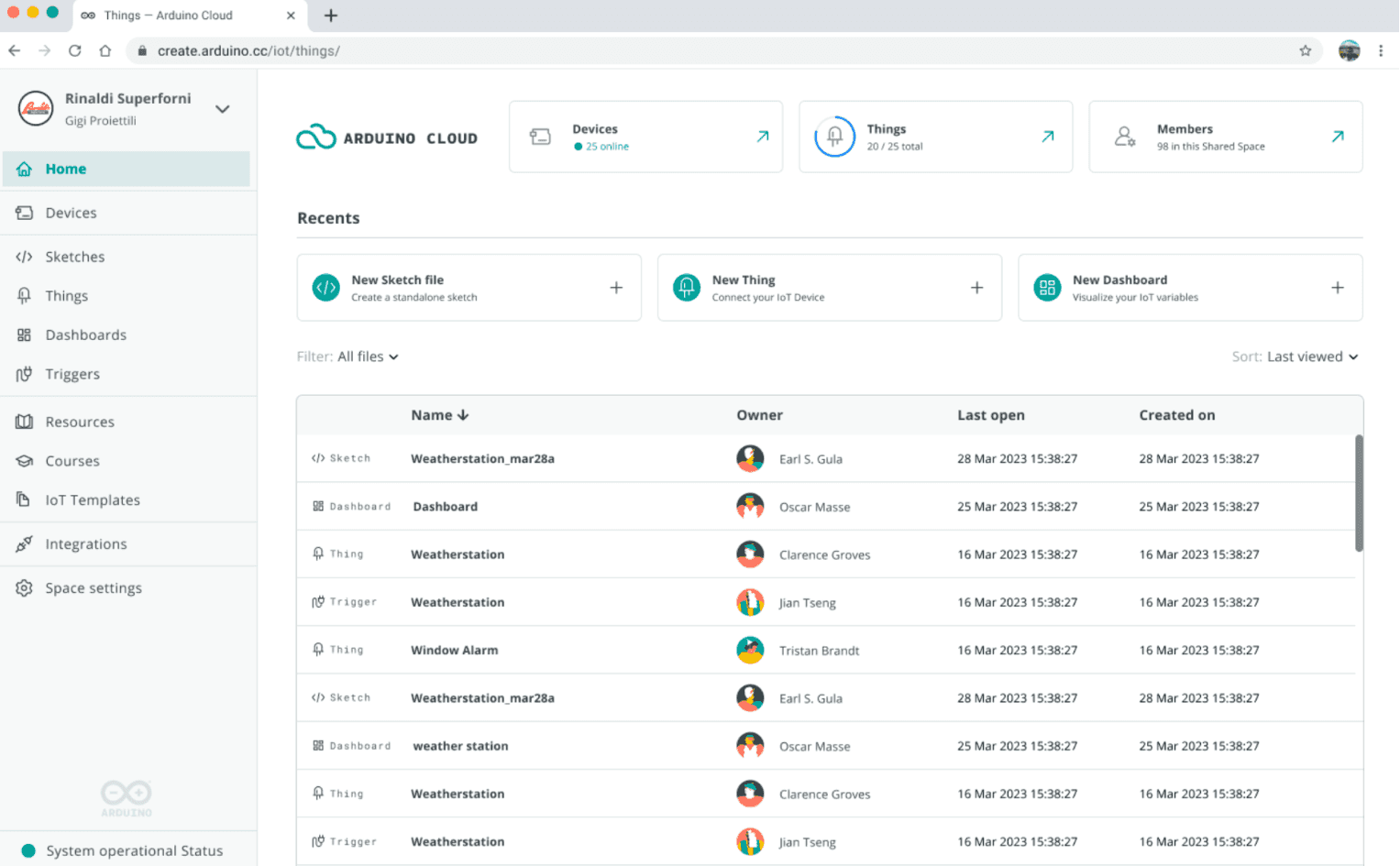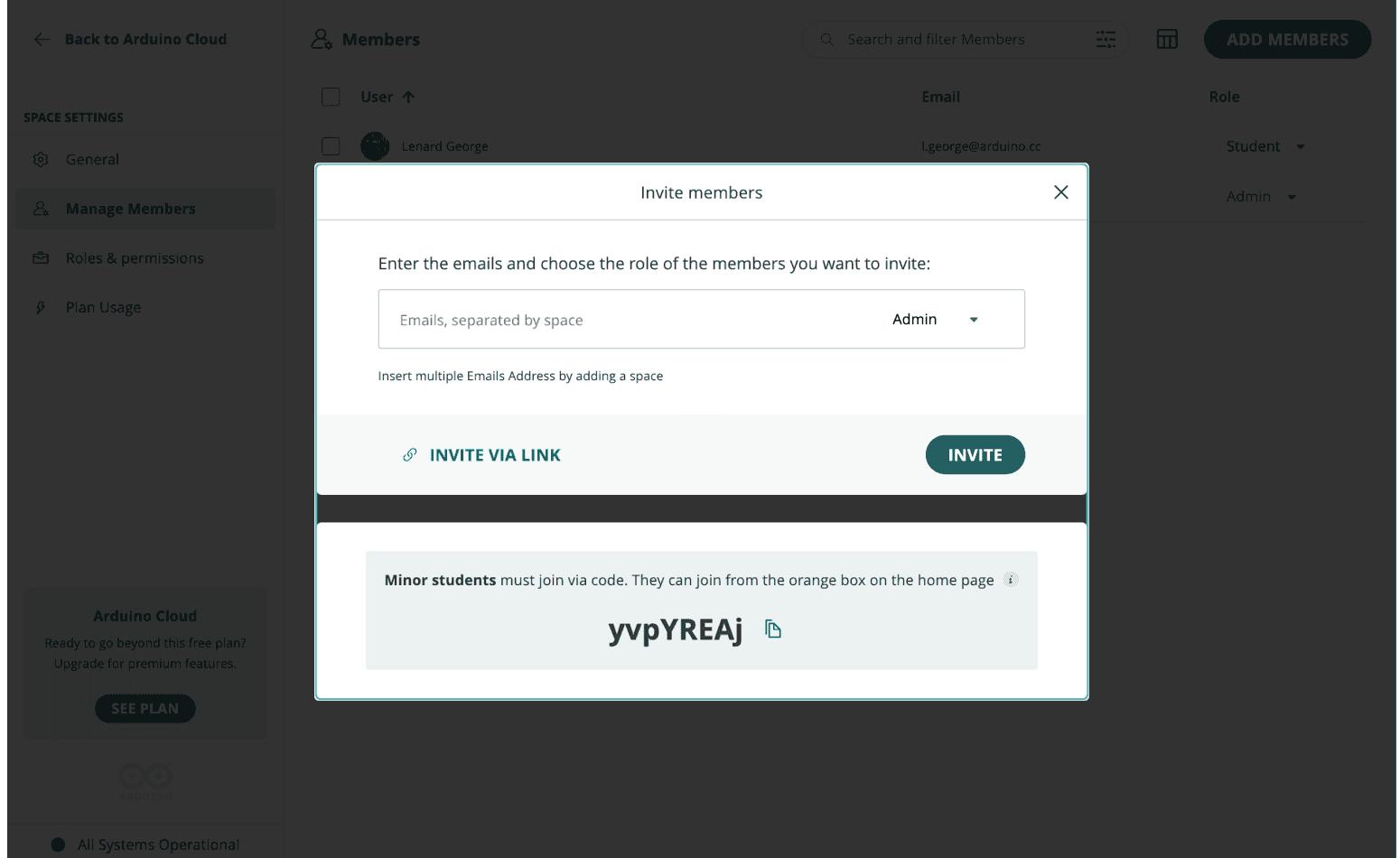 Congratulations! Now you own a shared space linked to your Arduino account. In the next section we will show you how to add members into your space and make it lively.
