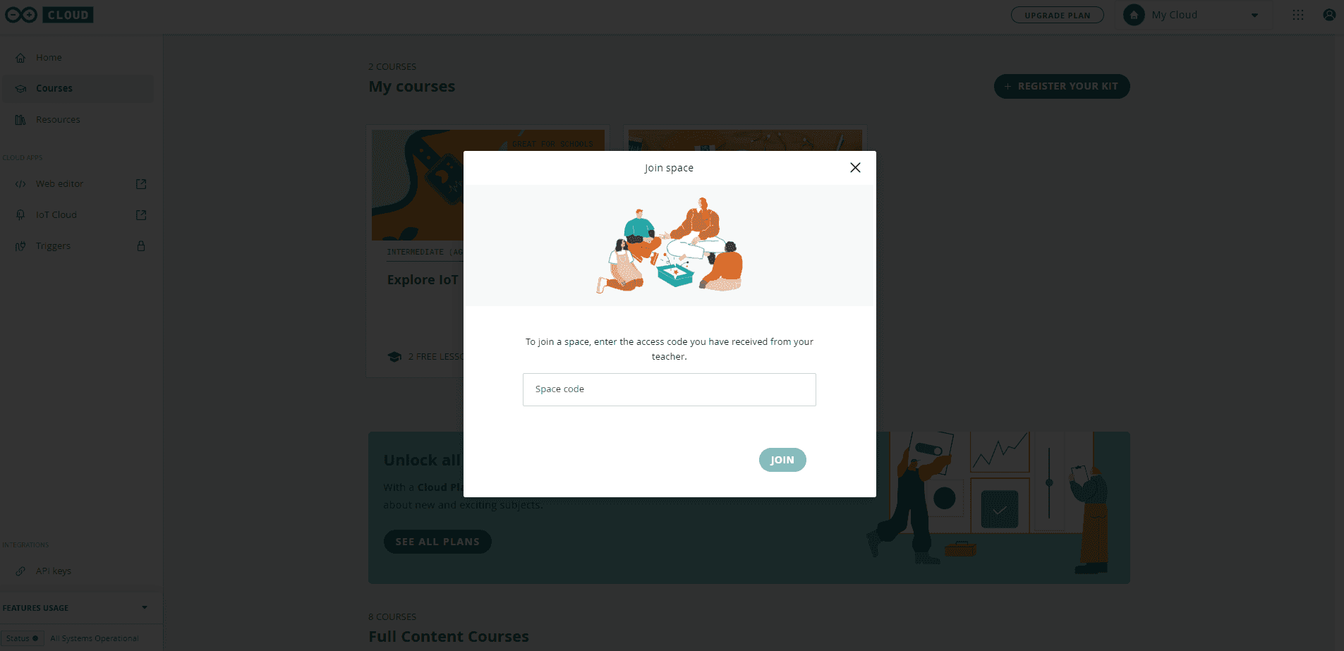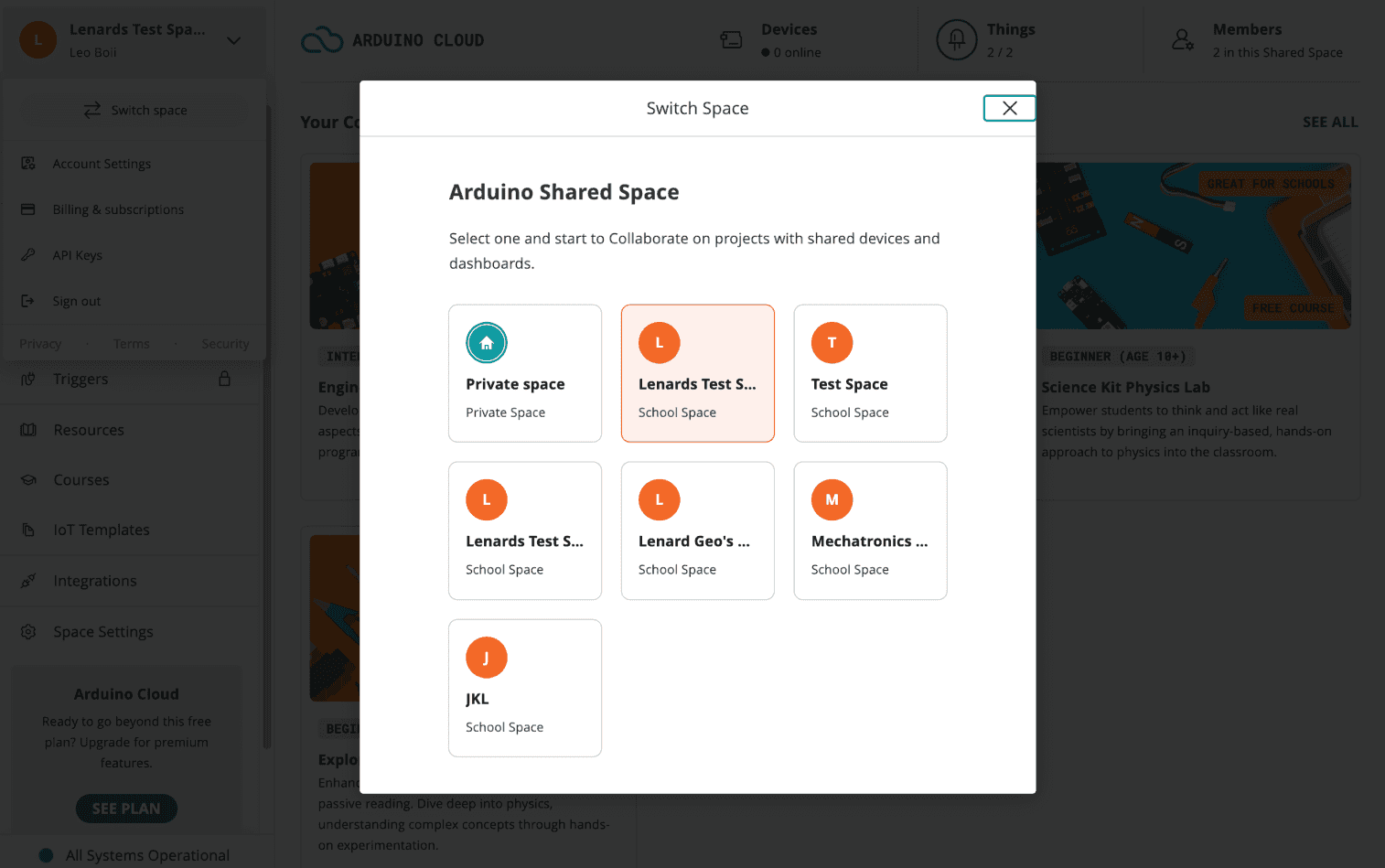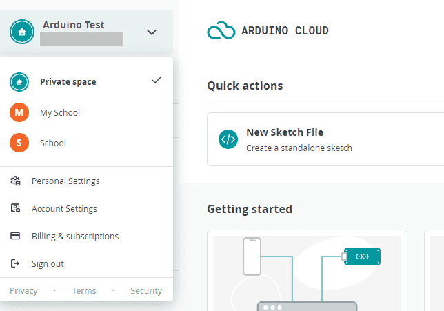 Note: A private space is an automatically created once joined Arduino Cloud. You can use this space for personal projects you do not want to share with all your class.