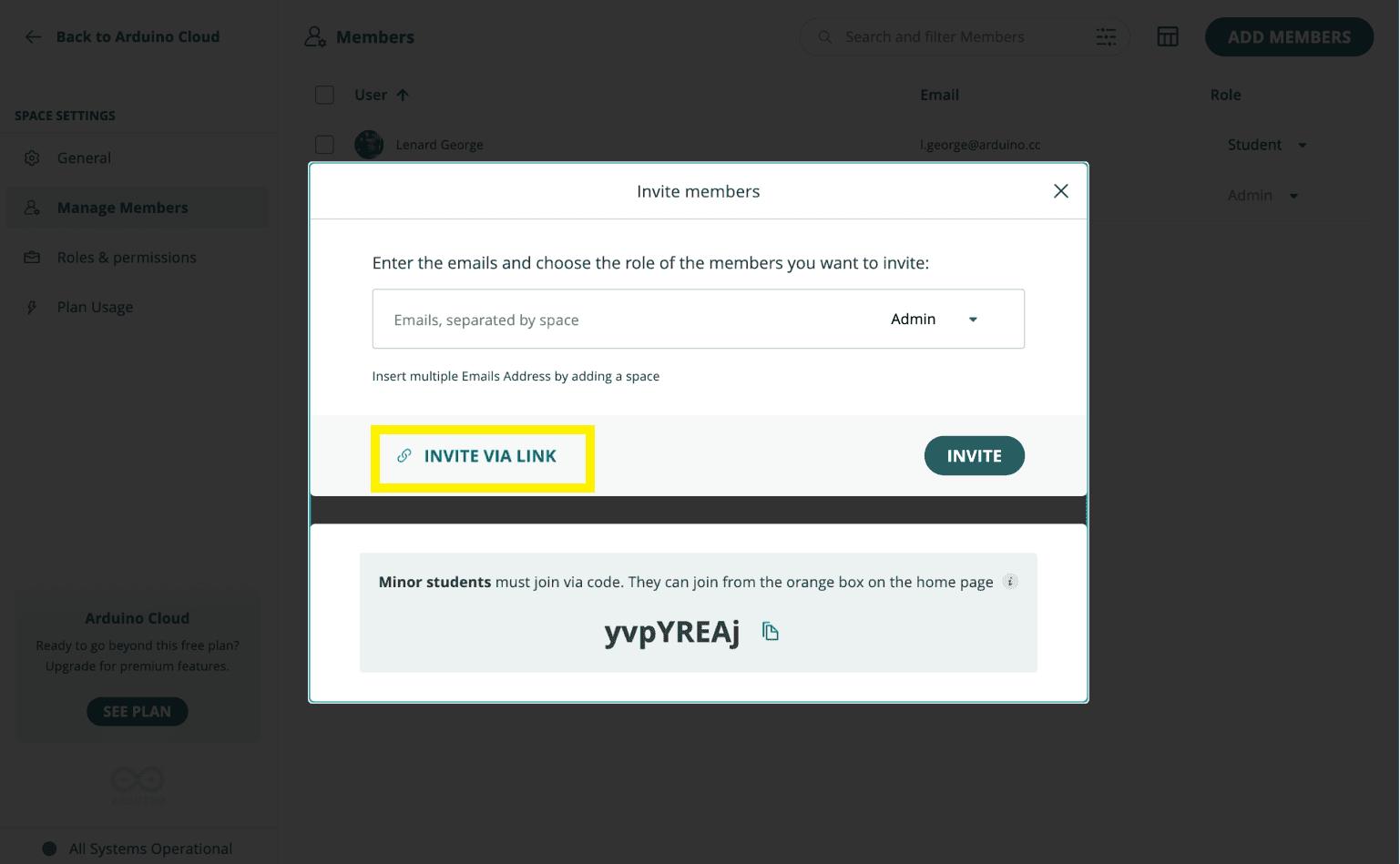 As minors have restricted access to content and tools they have a slightly different way of joining a shared space. It is mandatory that you ensure that you have created a Junior Arduino account for them before you proceed.
