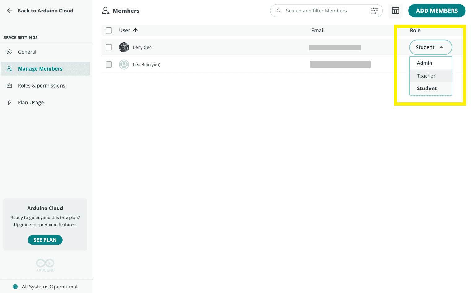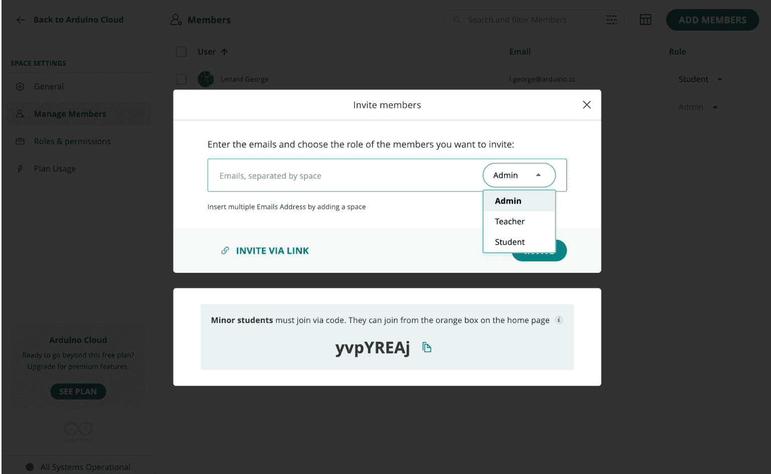 Define which role they will cover in your space based on the available options. There are three role types in Arduino Cloud for Schools: