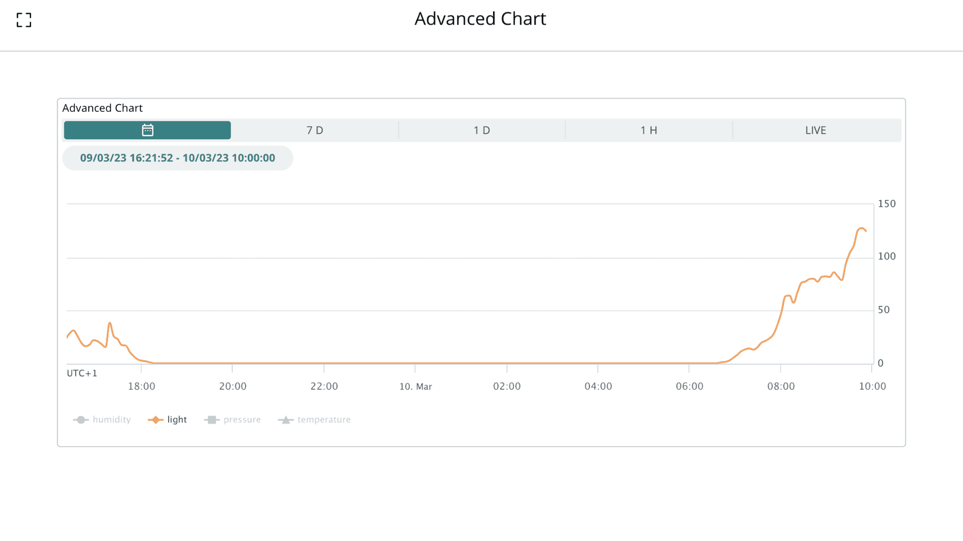 The advanced chart widget is used to display data from several Arduino Cloud variables in a single chart. You can track the data in both real time, select from a specific time period while selecting the variables you want to display.