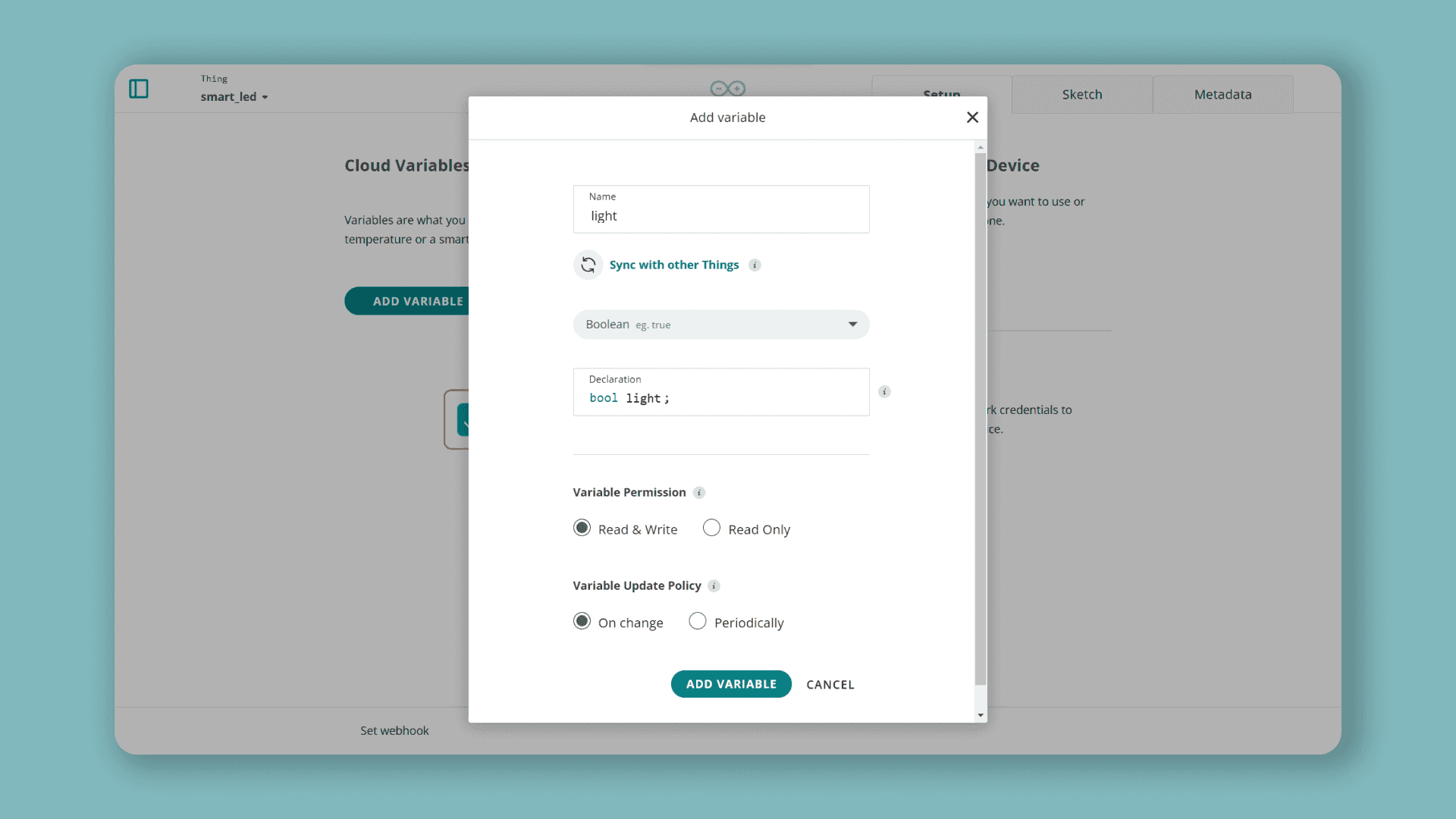 light, activate the interaction Modify from dashboard API and select the on change variable update. Once we have these characteristics set, click on add variable.Note: If you want to know more about how to get started with the Arduino Cloud, visit the getting started tutorial.