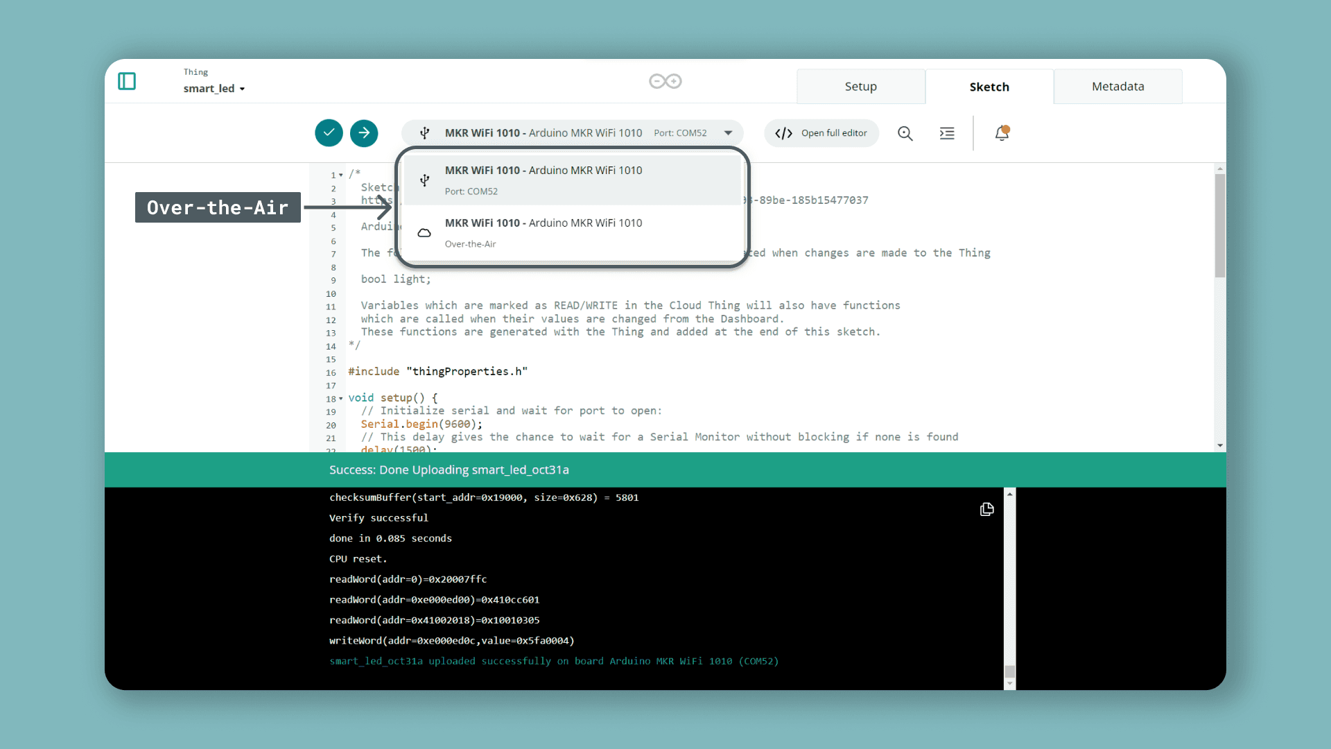 Note: This option will take a bit longer than usual, since the process of compiling and uploading the program to the board over-the-air is a longer process.