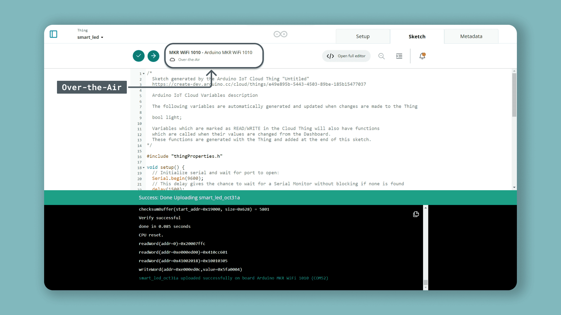 Now that we have checked that everything is working as it should, let’s go back to the Things > smart_led > Sketch tab in the Arduino Cloud, and see what has happened there.