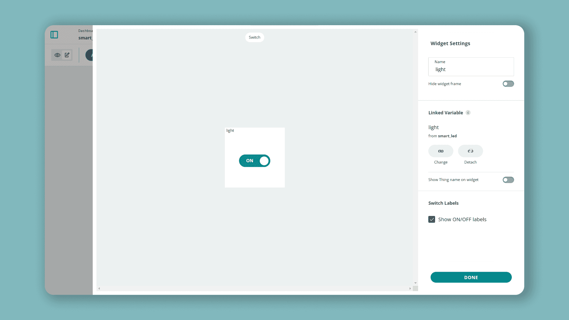 4. Next step is to create a dashboard with a Switch widget, linked to the lights variable that you created before. Once it is set, click on the use dashboard button and go to things > smart_led > Sketch