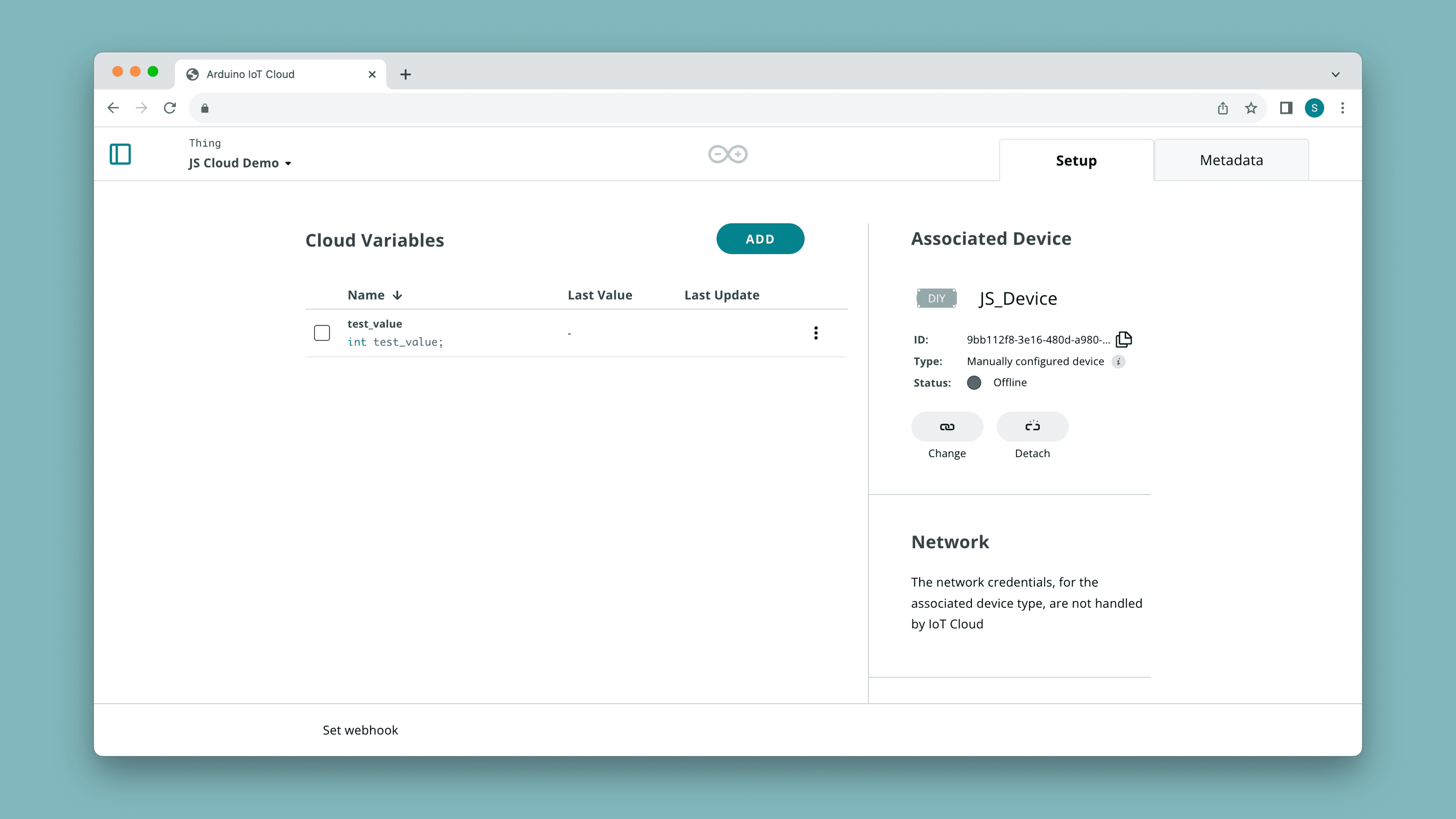 - Configure a manual device in the Arduino Cloud,
