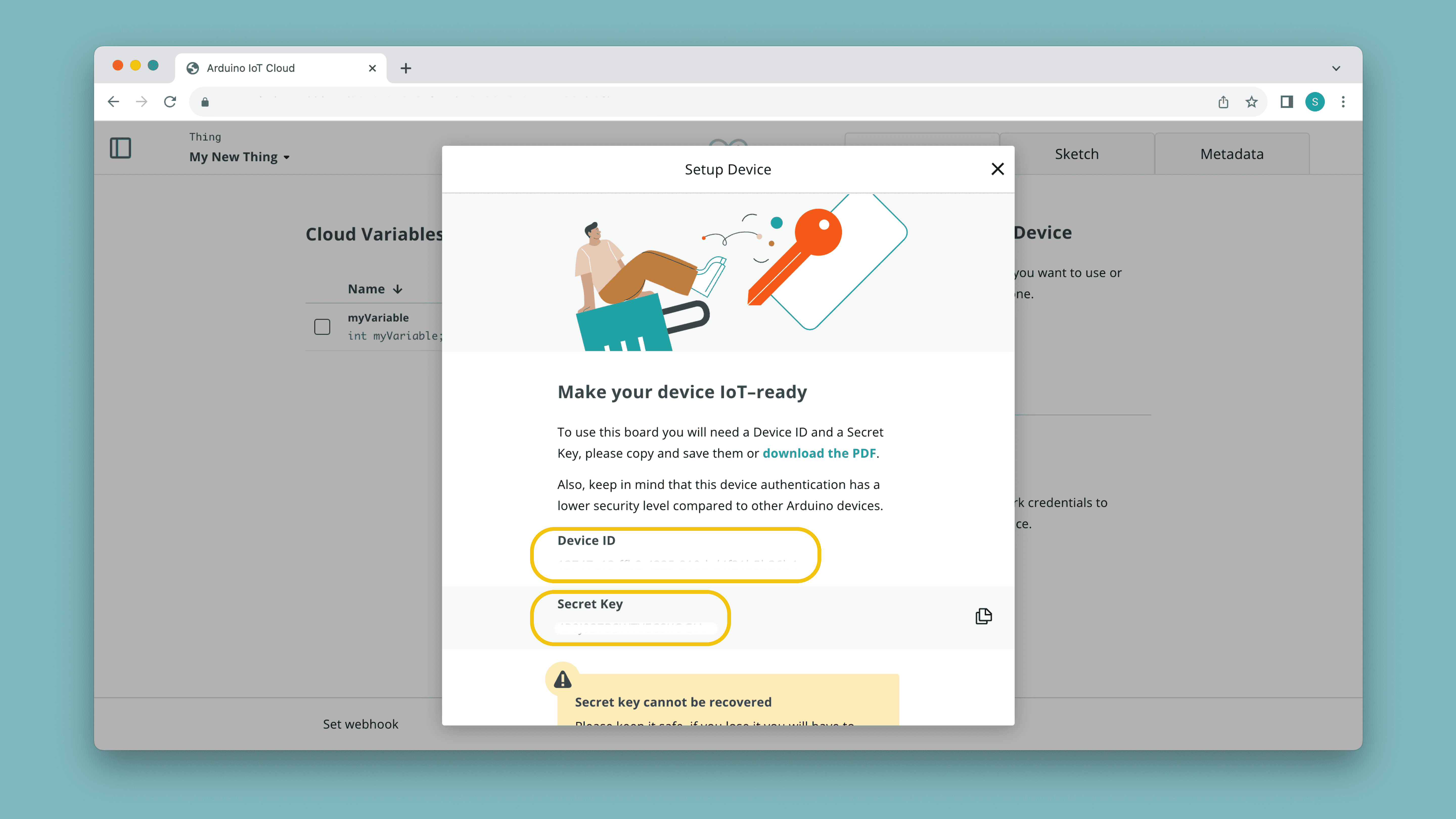 3. Select your board type, and give your board a name. When finished, you will generate a secret key and device ID. You can download or manually store your credentials somewhere, but the secret key can not be retrieved after you close the window.
