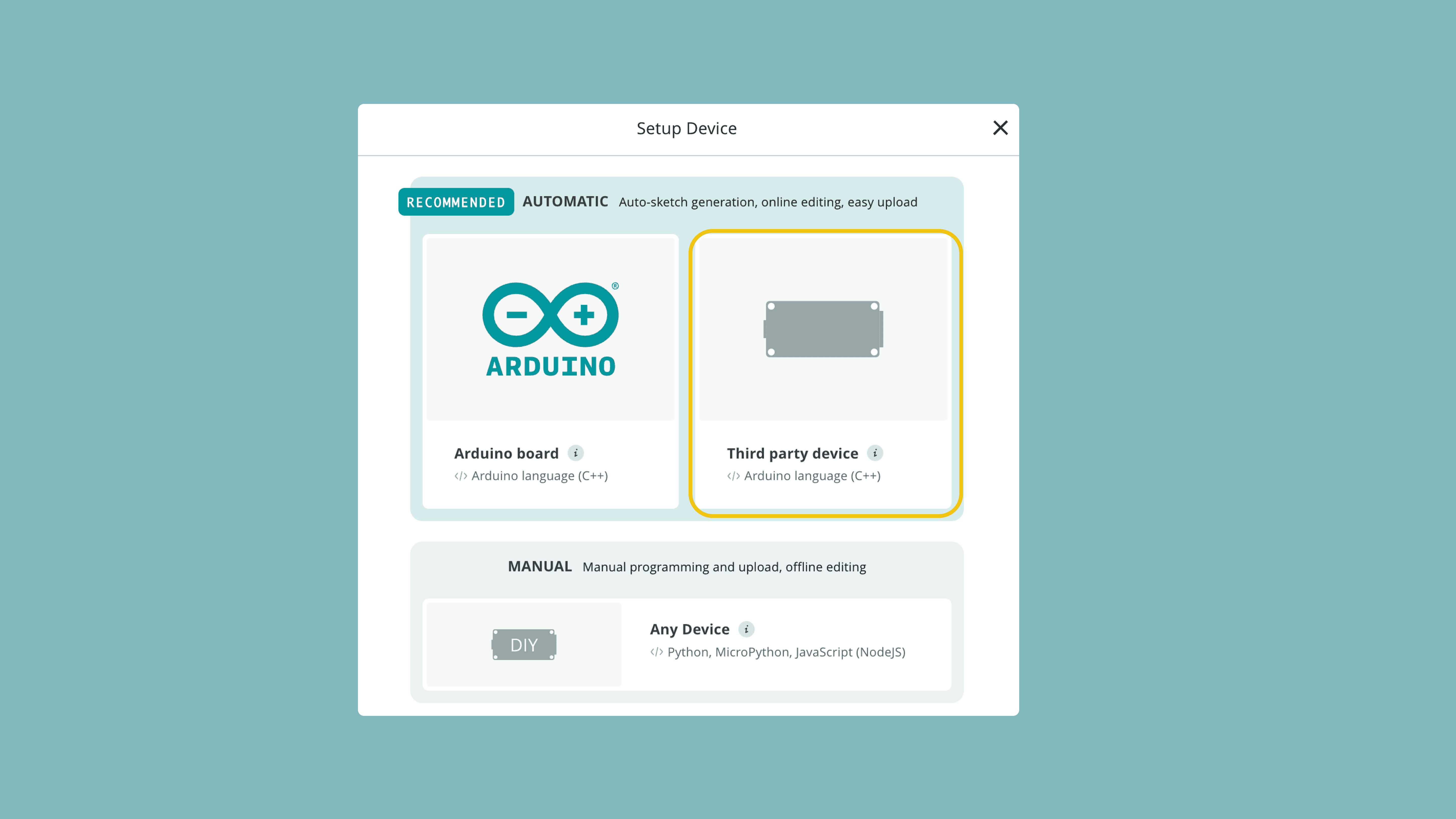 2. Go to Arduino Cloud, and navigate to the "Devices" section. Click on the "Add Device" button and then select the "Third Party Board".