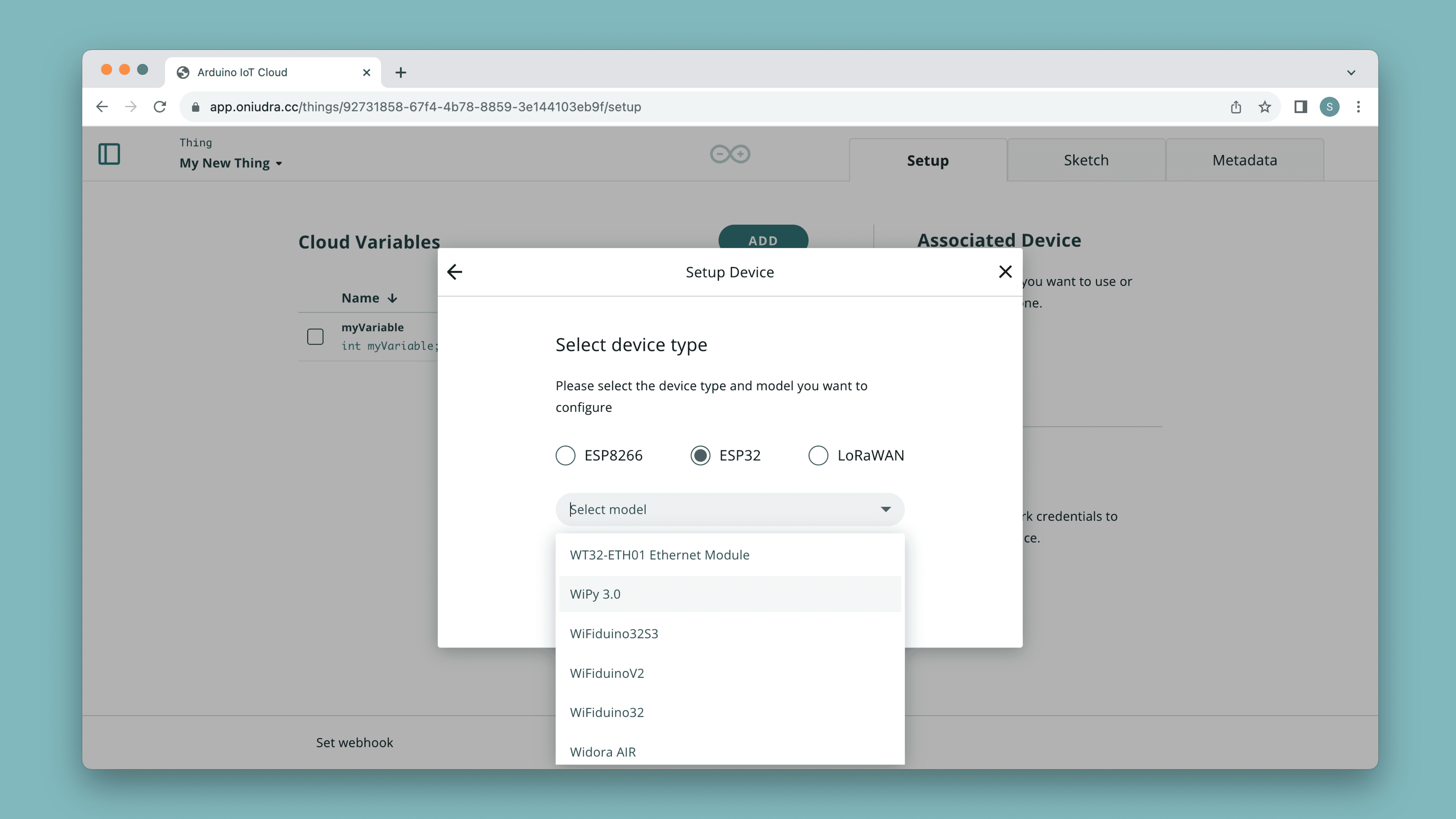To configure an ESP32 board in the Arduino Cloud, follow the steps below: