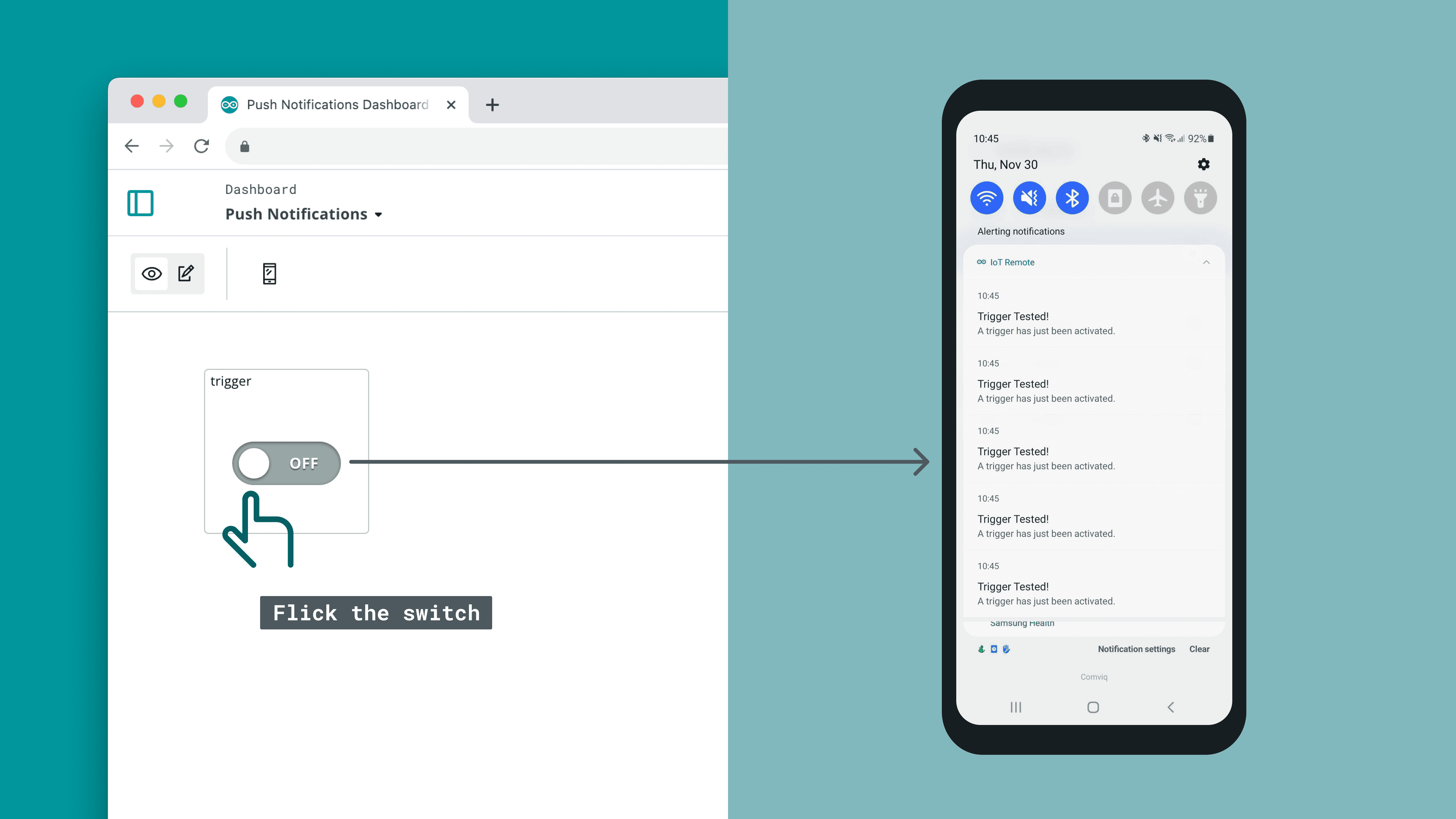 variable, similarly to how we set up the trigger.triggerOnce linked, flick the switch. It should immediately go back to its "off" state, and you should now receive a notification in your phone.