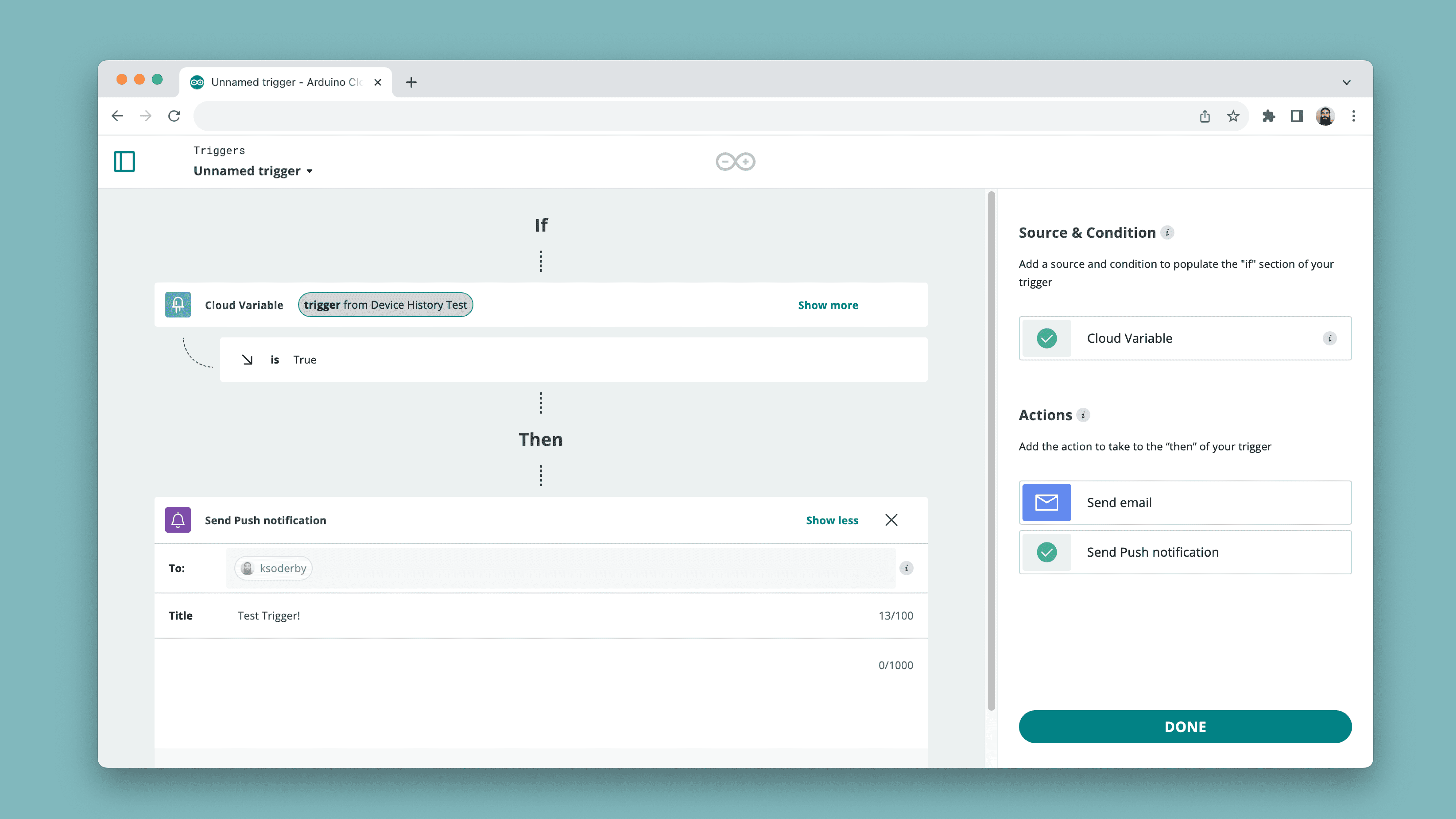 . When complete, it should look something like the image below. To finish, click on "Done", in the bottom corner."Reminder to make coffee!"Your push notification is now active, just waiting to be "triggered". To trigger it, we are going to use a dashboard.