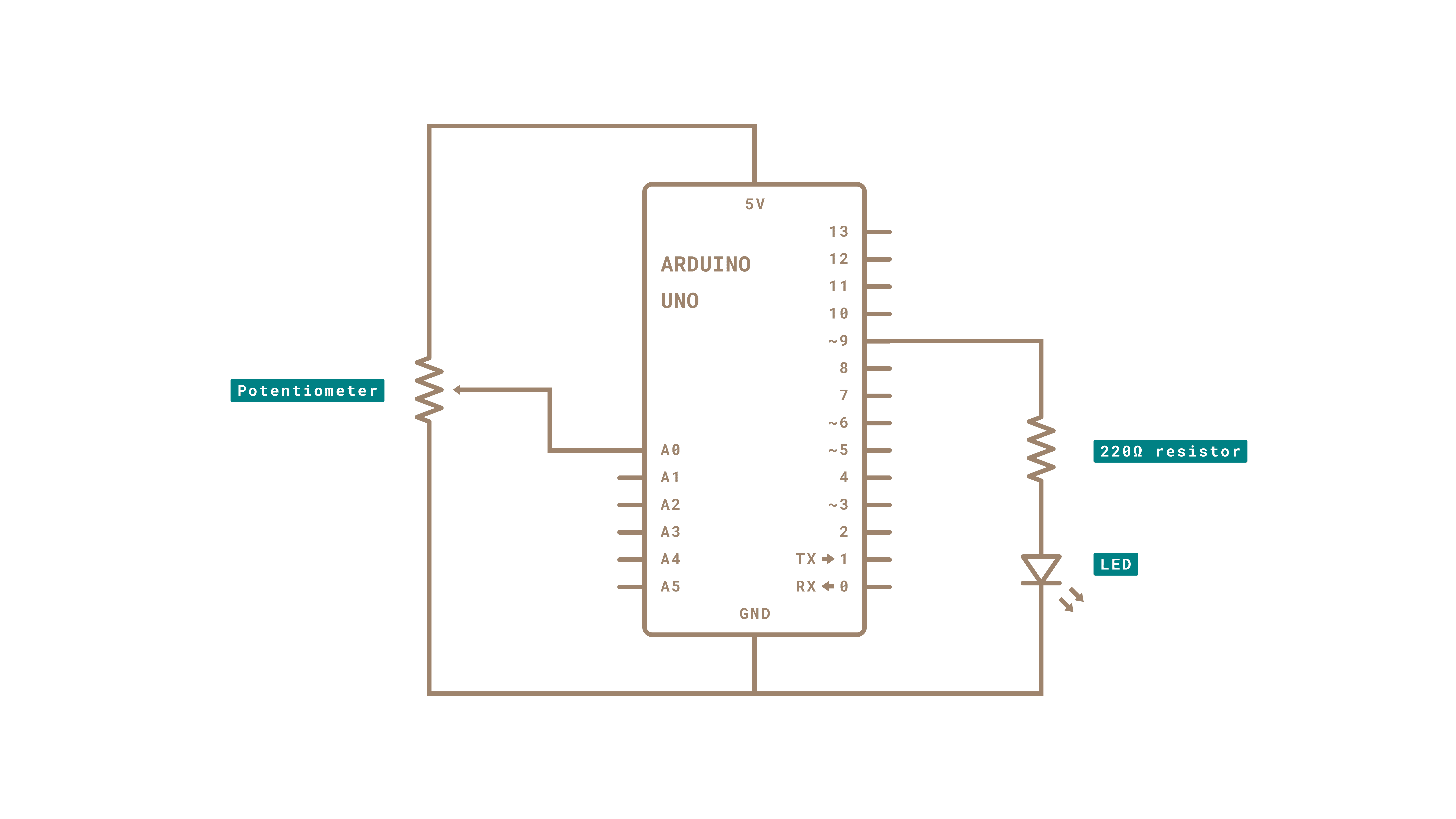 Connect one pin from your pot to 5V, the center pin to analog pin 0 and the remaining pin to ground. Next, connect a 220 ohm current limiting resistor to digital pin 9, with an LED in series. The long, positive leg (the anode) of the LED should be connected to the output from the resistor, with the shorter, negative leg (the cathode) connected to ground.