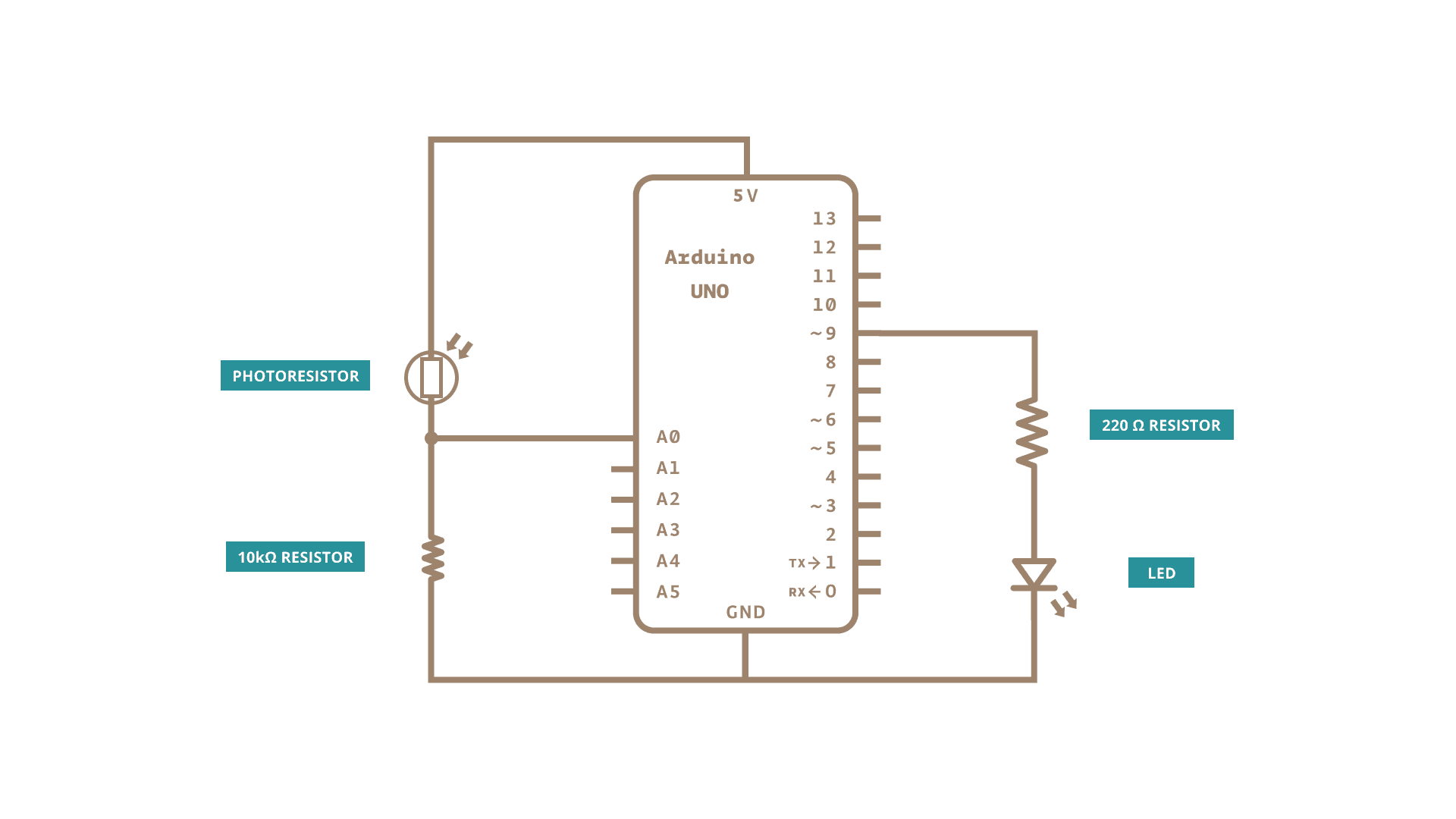 Connect an LED to digital pin 9 with a 220 ohm current limiting resistor in series. Connect a photoresistor to 5V and then to analog pin 0 with a 10K ohm resistor to ground.