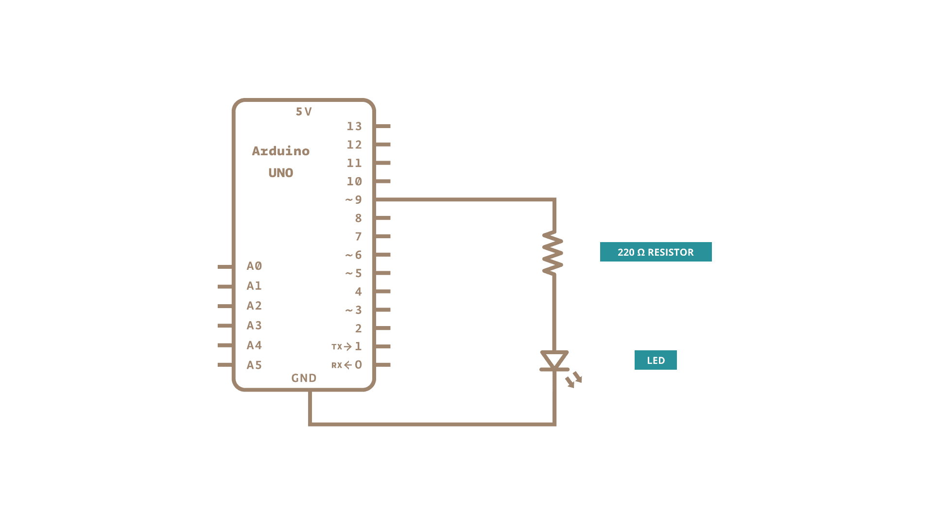 An LED connected to digital output pin 9 through a 220 ohm resistor.