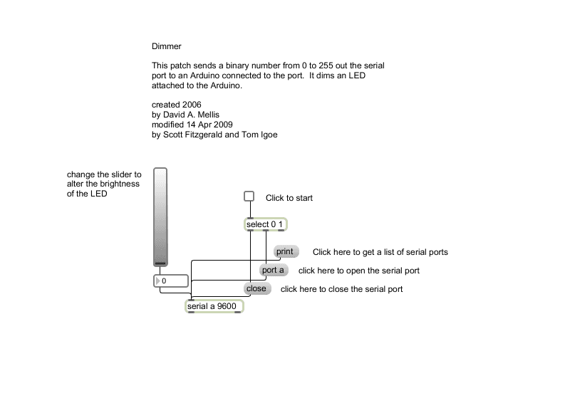 The Processing sketch in the code sample above will send bytes out the computer serial port to the board to dim the LED.