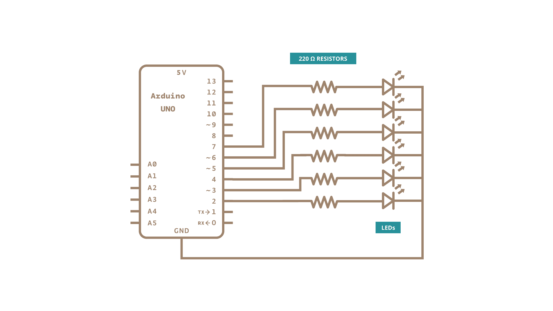 Connect six LEDS, with 220 ohm resistors in series, to digital pins 2-7 on your Arduino.