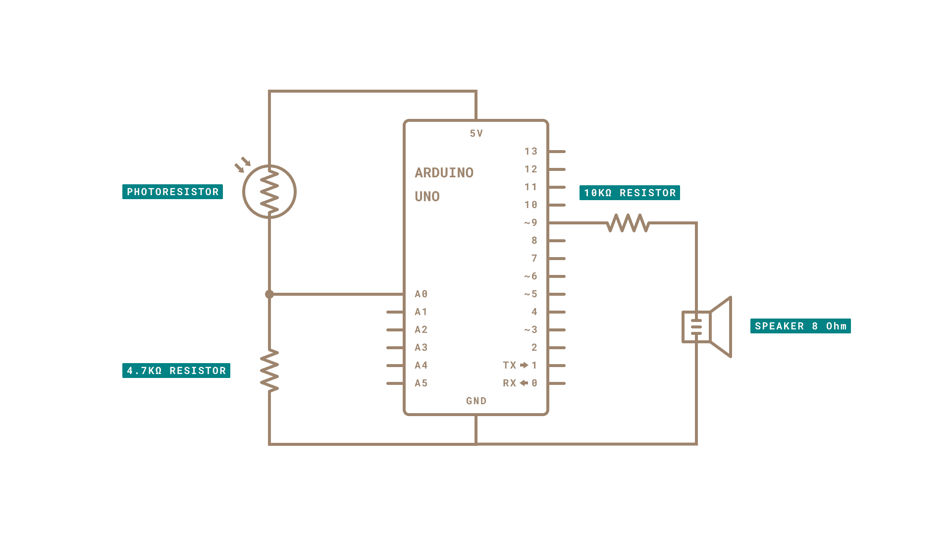 Connect one terminal of your speaker to digital pin 9 through a 100 ohm resistor, and its other terminal to ground. Power your photoresistor with 5V, and connect it to analog 0 with the addition of a 4.7K resistor to ground.