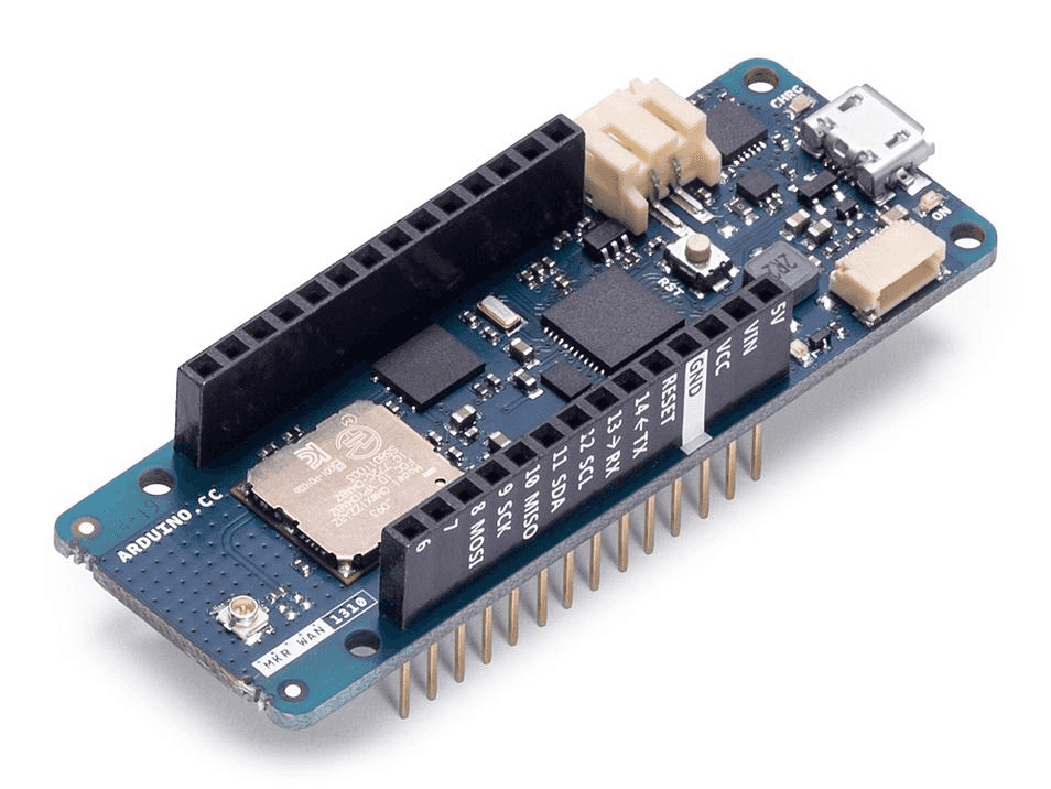 The MKR WAN 1300 and 1310 boards provide you with a practical and cost-effective solution to applications that require LoRa® connectivity and low-power consumption. The MKR WAN 1300 and 1310 boards are based on a SAMD21 microcontroller from Microchip®; they also features a CMCMWX1ZZABZ module from Murata® for LoRa® connectivity, the ATECC508 cryptoauthentication device for security, and a 2MB SPI Flash memory for onboard storage.