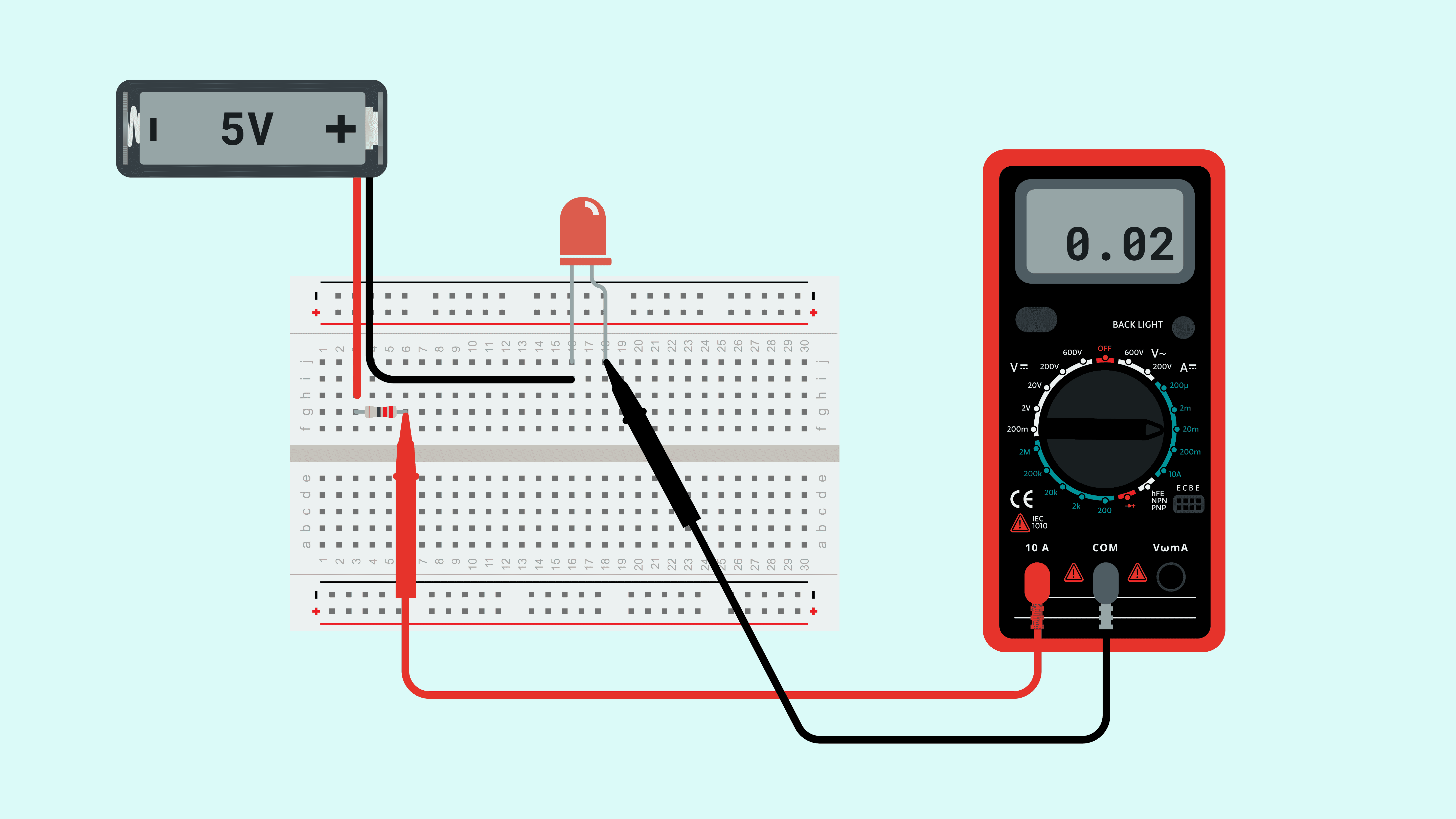 The image below shows how to read the current flowing through a circuit with a LED and a resistor. Here, you can see how the multimeter is connected in series with the resistor and the LED, as if it was one more component of the circuit.