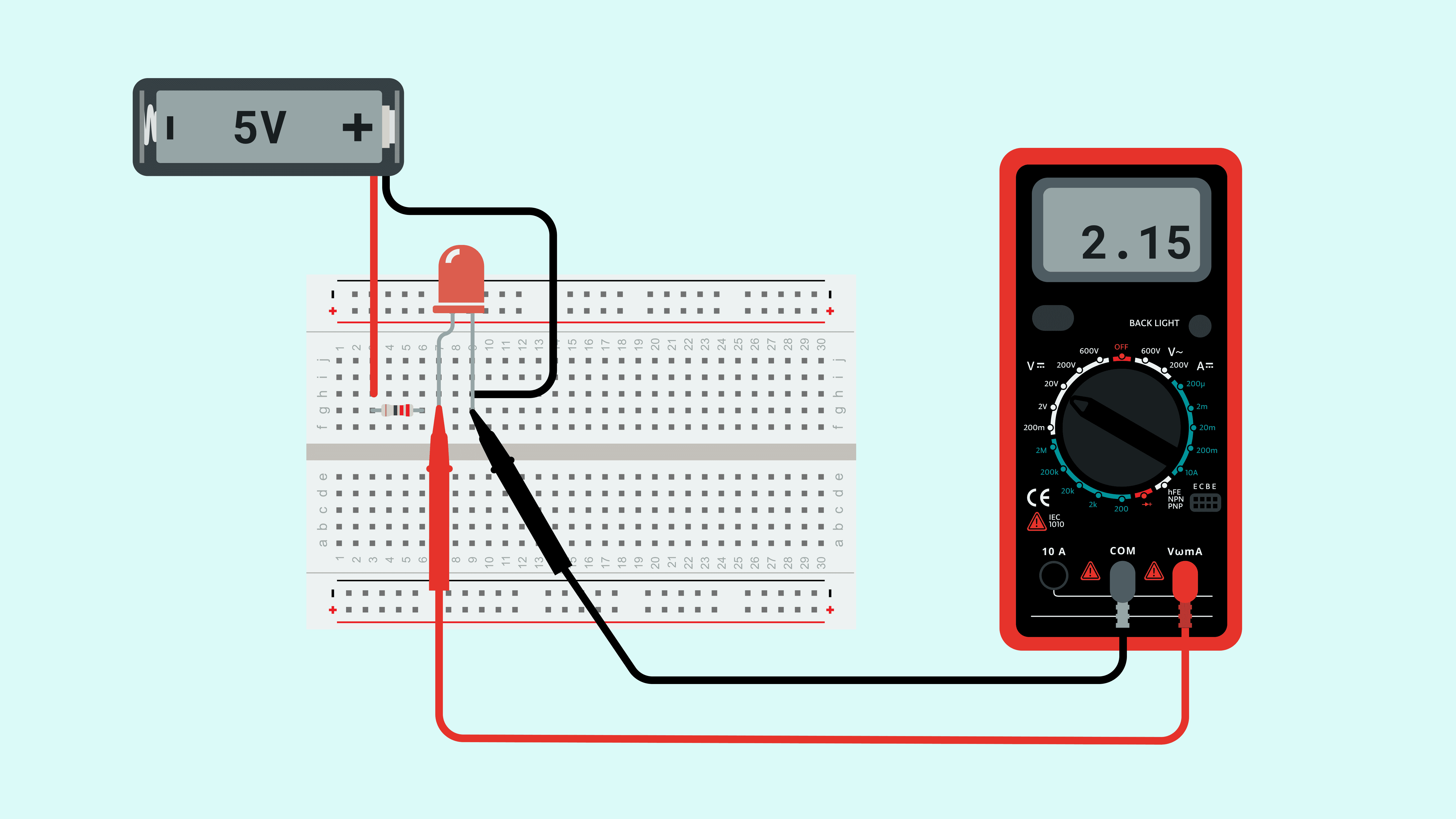 The image below shows how to read the voltage falling in an LED. In order to know the voltage falling on a component, you will need to connect the multimeter in parallel with it.
