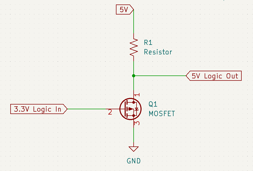 This circuit uses the MOSFET as a switch and takes the 5V logic from the drain. It is useful if the logic inversion can be treated, as 3.3V logic becomes inverted. To begin with MOSFET, a 2N7000 or a BSS138 MOSFET can be used for this circuit.