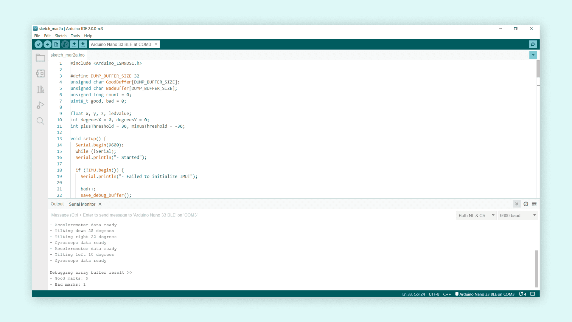 A simple example will demonstrate the implementation of some of the debugging techniques we discussed before and how they can be handy for the development process of code in the Arduino® ecosystem. We will use the Arduino® Nano 33 BLE Sense board, and its onboard inertial measurement unit (IMU) features to show the debugging process's importance. The example code uses accelerometer, gyroscope, and magnetometer data simultaneously, having the tasks be executed to obtain every value: