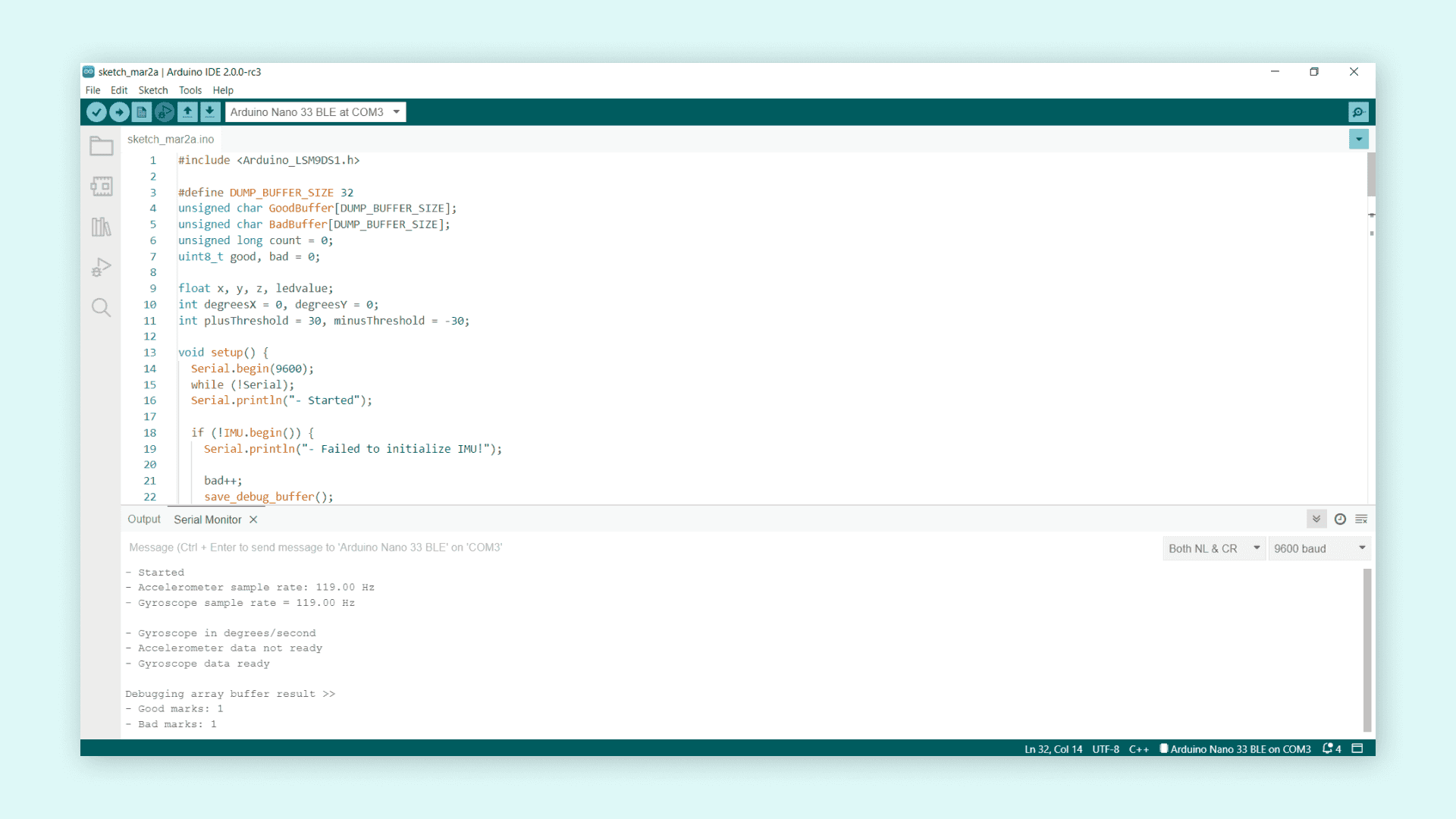 33 if (!IMU.begin()) {34 Serial.println("- Failed to initialize IMU!");35 36 bad++;37 save_bebug_buffer();38 disp_debug_buffer();39 debug_stop();40 }41