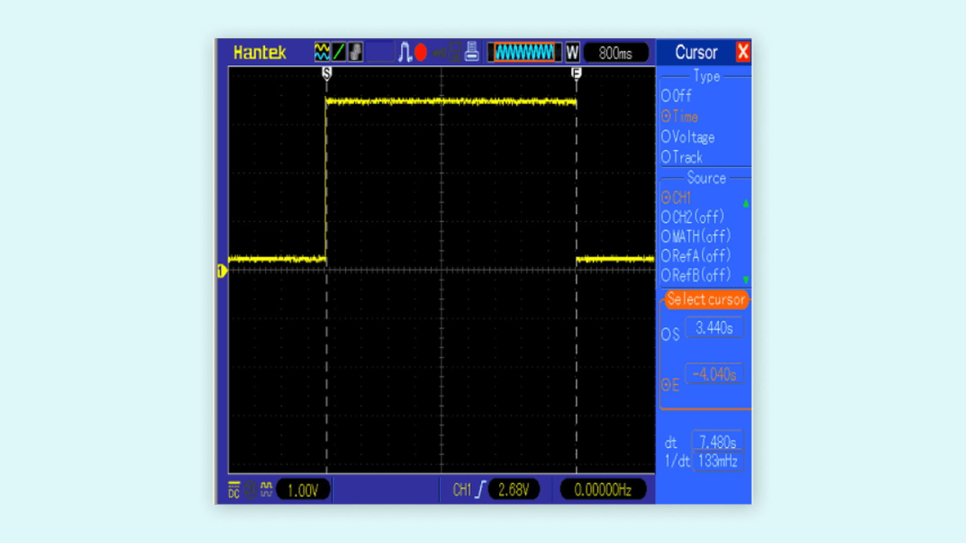 digitalWrite(12, HIGH) instruction before tasks are called instruction and a digitalWrite(12, LOW) instruction after the tasks are executed to measure the time it takes to complete them using GPIO 12 of the board and an oscilloscope. This can also be helpful to understand the power consumption it draws from this runtime instance:1void loop() {2 for (int i = 0; i < 5; i++) {3 digitalWrite(12, LOW);4 accelerometer_task();5 gyroscope_task();6 magnetometer_task();7 digitalWrite(12, HIGH); 8 }9 10 save_debug_buffer();11 debug_stop();12}