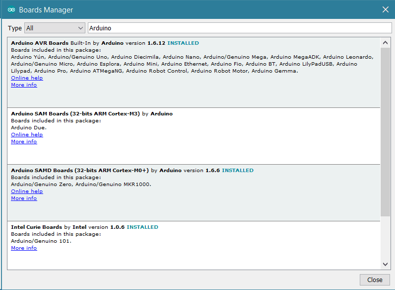 After installation is complete an Installed tag appears next to the core name. You can close the Board Manager.