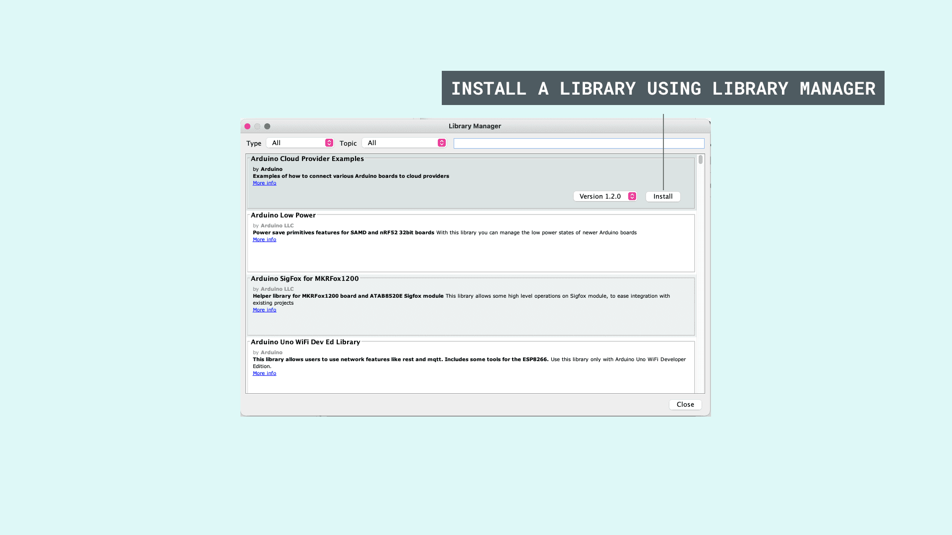 Now the new library will be available in the Sketch > Include Library menu. If you want to add your own library to Library Manager, follow these instructions.