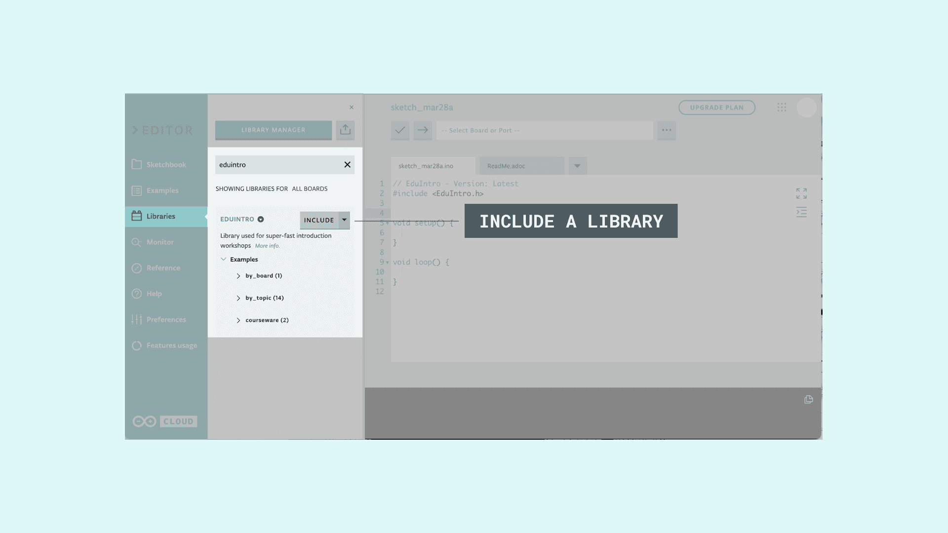 The process of setting up libraries on the online IDE (Arduino Web Editor) is quite similar to the offline one: