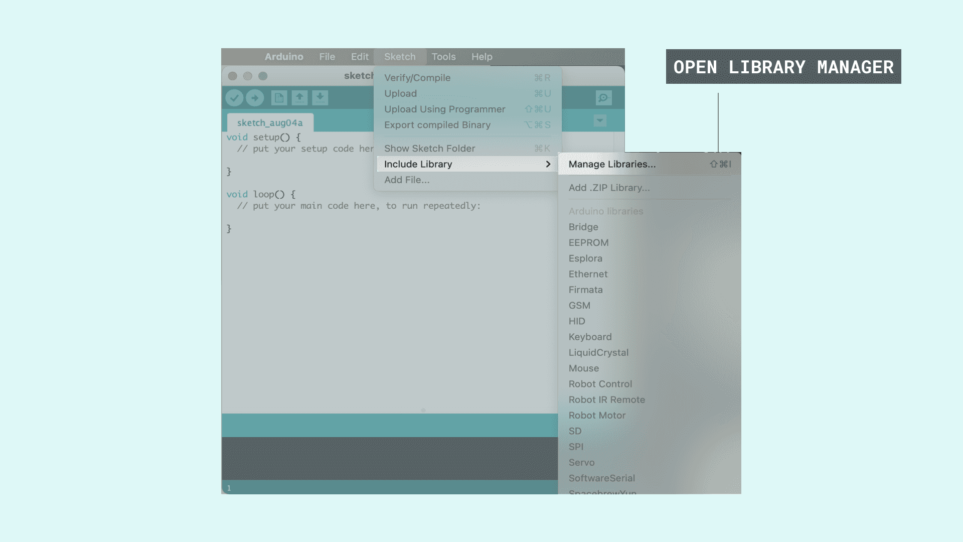 1. Open the IDE and click "Sketch" on the menu tab and then Include Library > Manage Libraries.