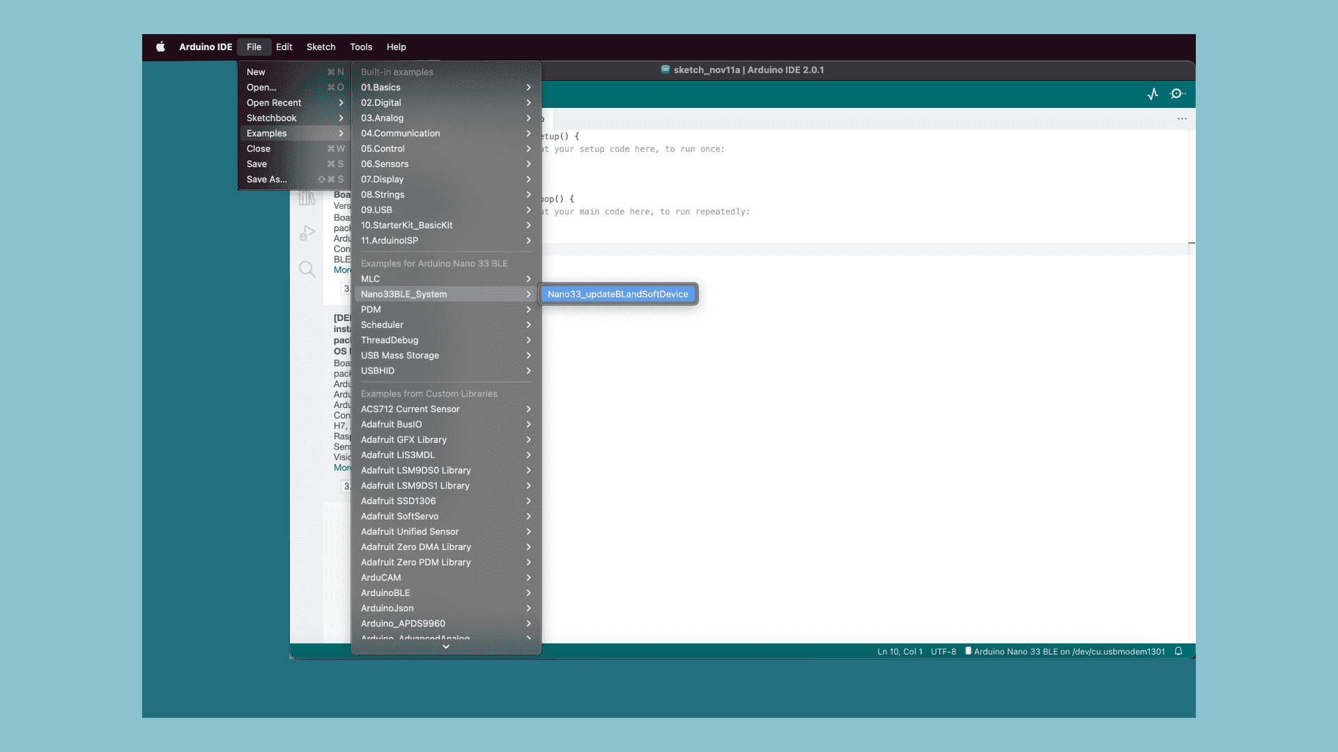 In the Nano 33 BLE core is an example sketch that you will use to update the bootloader and SoftDevice of your board. Go back to the Arduino IDE and navigate to