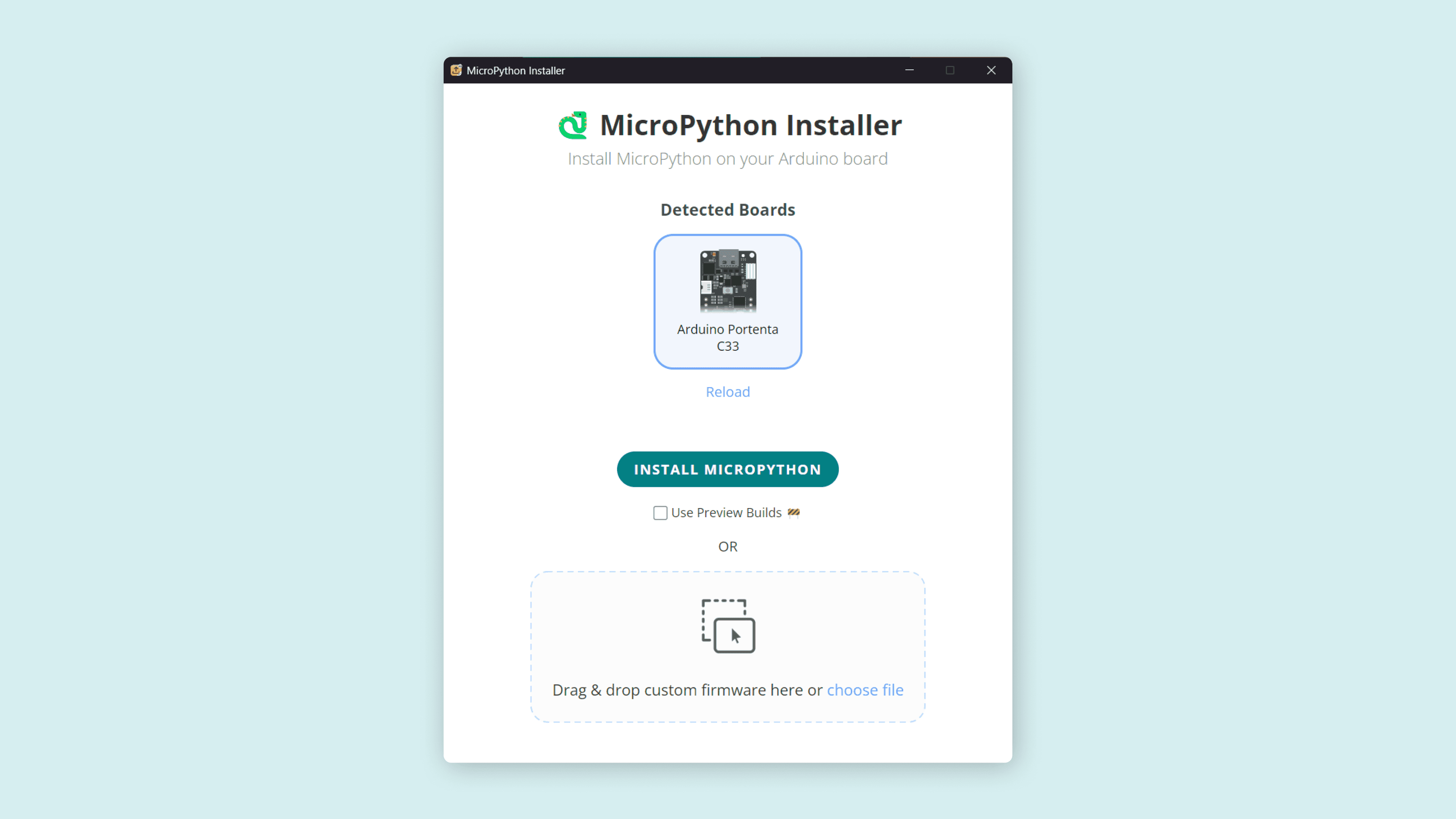 To install the MicroPython firmware to the Portenta C33 board, you can use the Arduino MicroPython Installer. This tool lets you plug in the board, select it from a menu, and automatically flash the latest firmware or a custom one of your choice to the board. You can download the Arduino MicroPython Installer here.