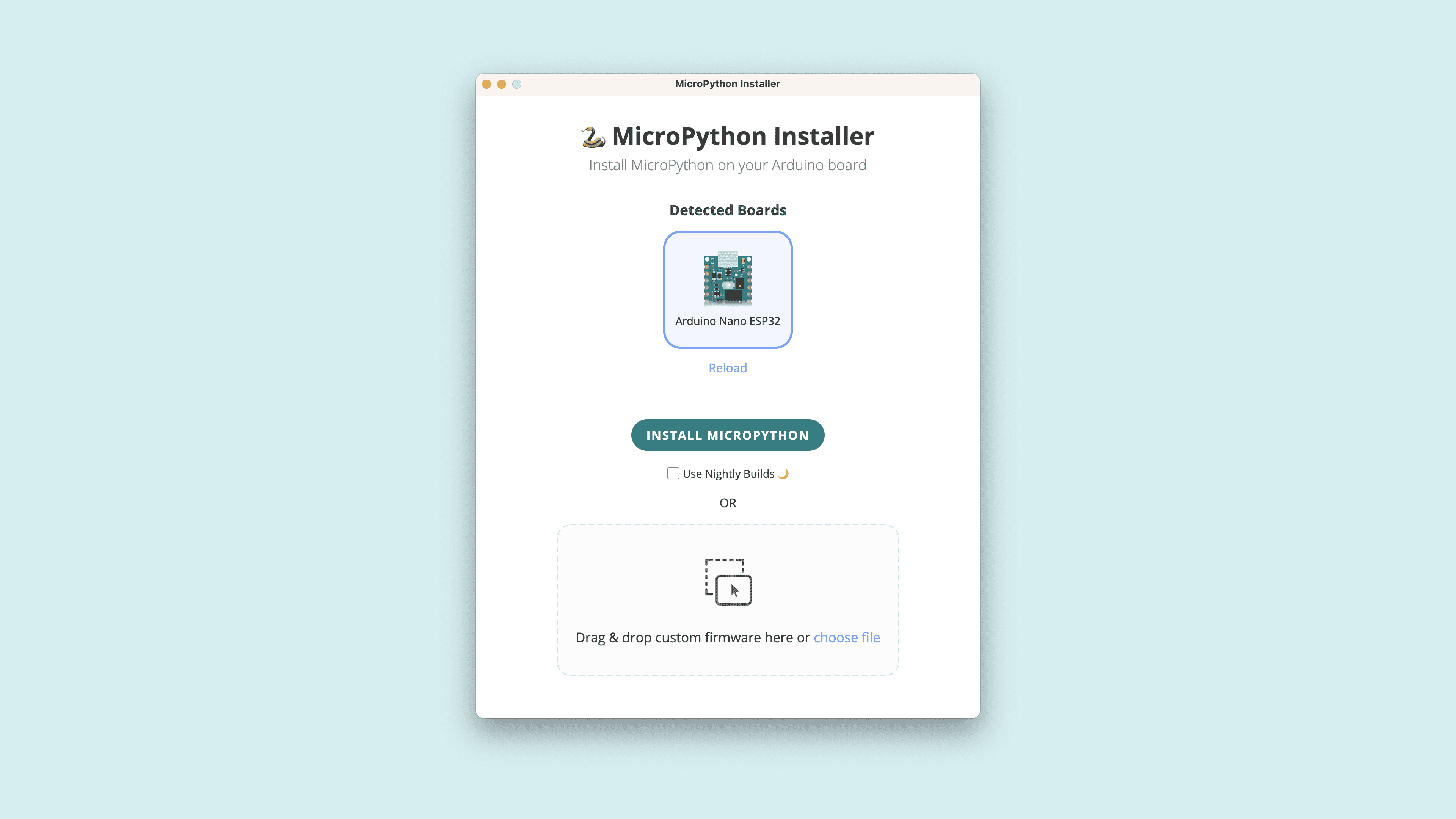 With the latest board package installed, open the Arduino MicroPython Installer and plug your board into your computer; your board should appear ready to be selected, as shown in the image below. If your board does not appear in the installer, try putting it in bootloader mode by double-tapping your board's reset button.