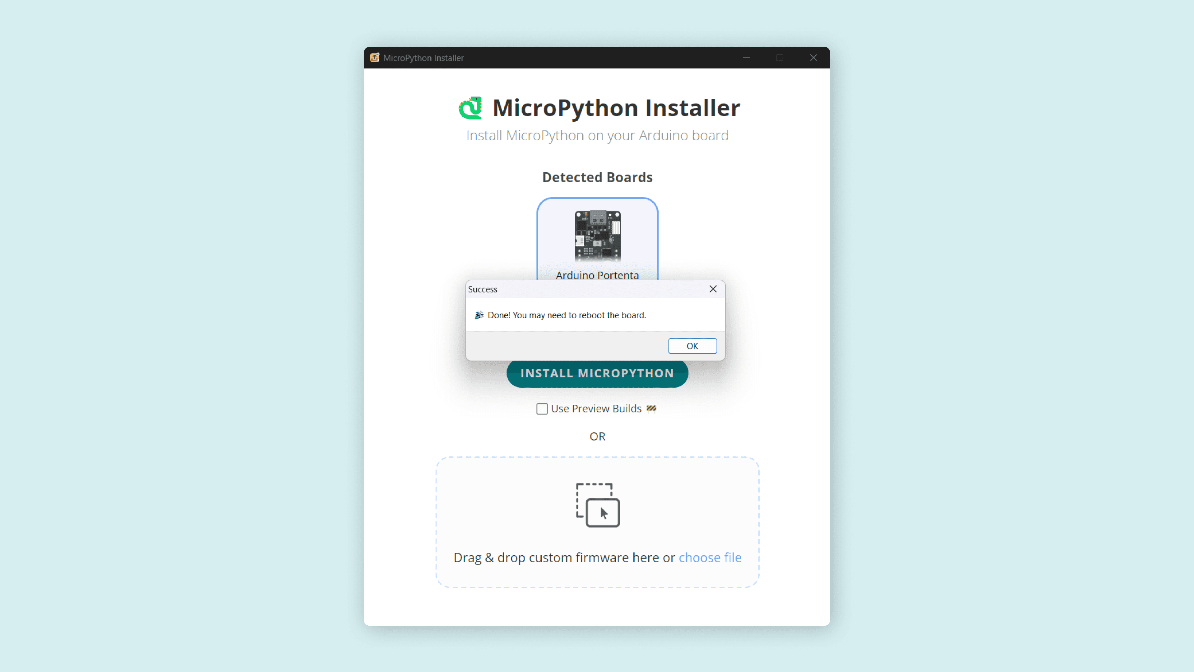 To install the MicroPython firmware, press the INSTALL MICROPYTHON button and wait a few seconds while the installer tool takes care of everything else. When finished, you should see a message in the image below.