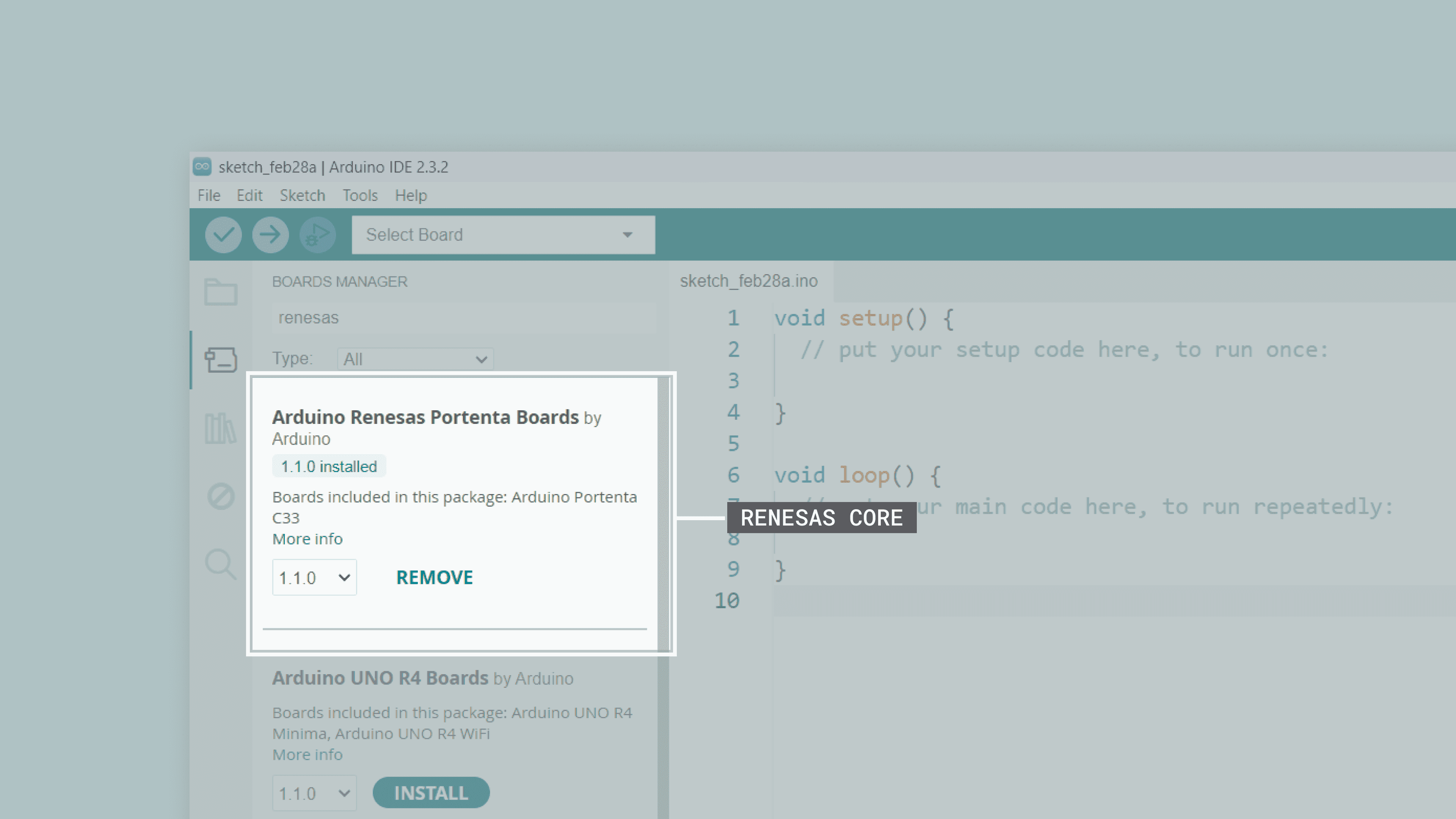 renesas and install the latest Arduino Renesas Portenta Boards version.
