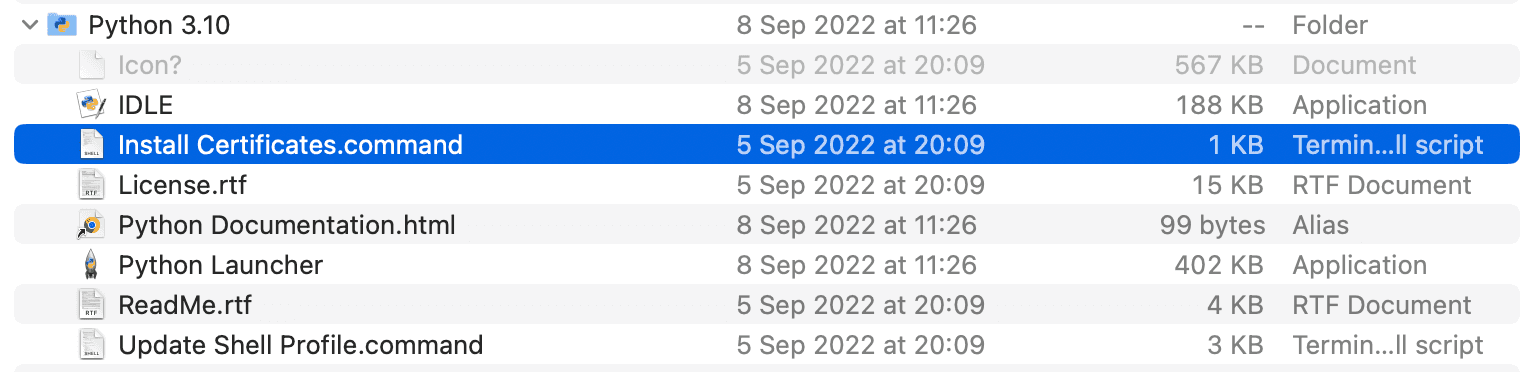 1[SSL: CERTIFICATE_VERIFY_FAILED] certificate verify failed:2unable to get local issuer certificate (_ssl.c:1002)This indicates a problem with the Python version installed, and that it is unable to locate the SSL certificate. To work around this, navigate to your Python installation (typically Applications > Python 3.X), and run the