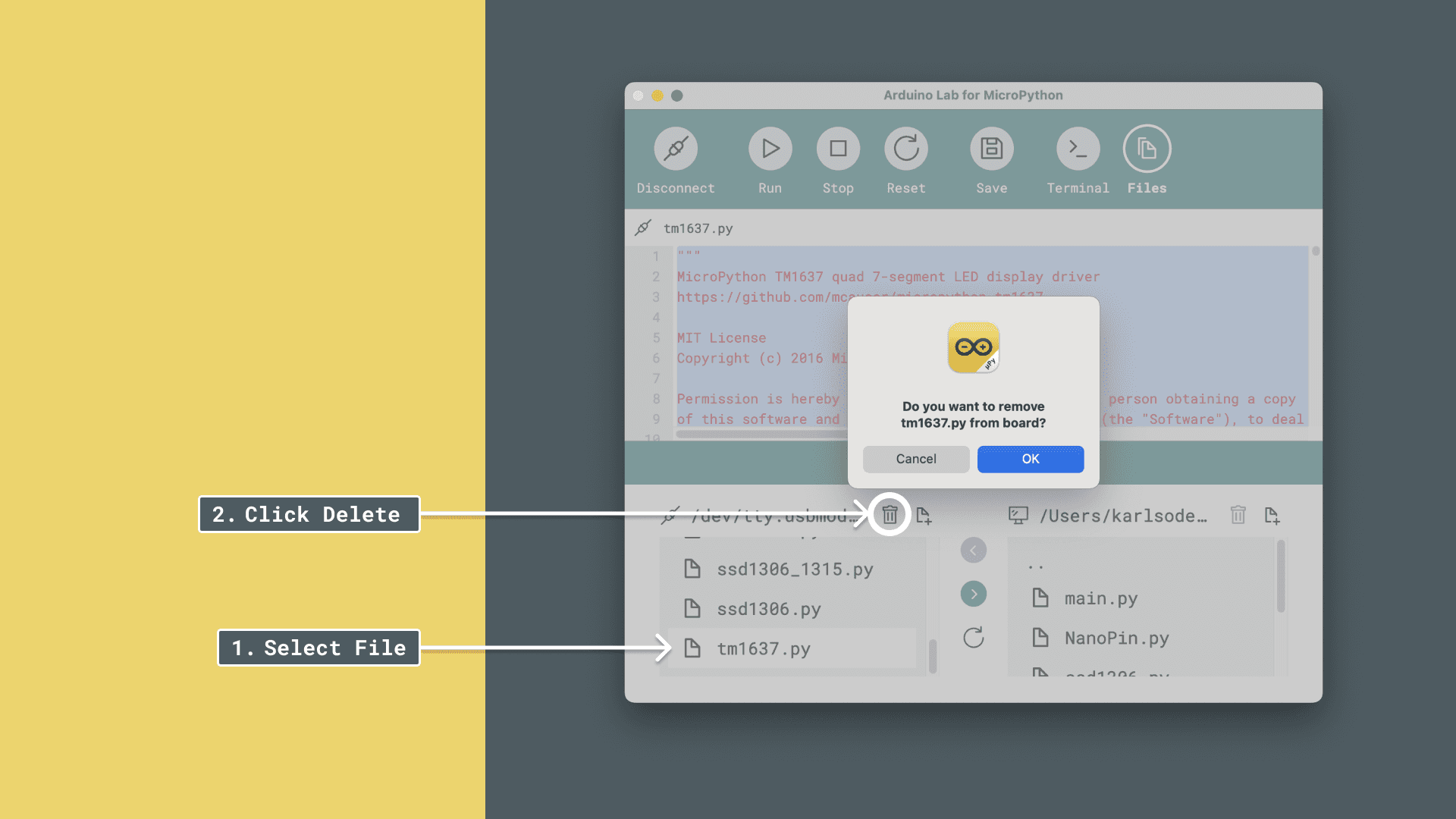 To delete a file from your board, open the Arduino Lab for MicroPython editor, connect to your board, and click the "File" button. This will open your local files as well as your board's files.