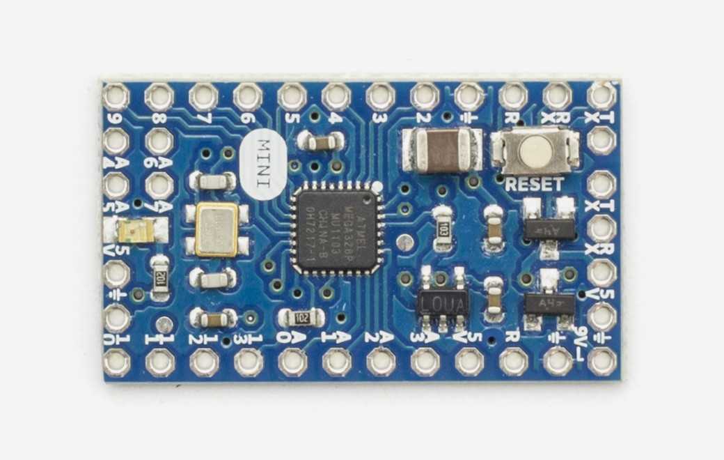 The Arduino Mini 05 is a small microcontroller board originally based on the ATmega168, but now supplied with the 328.(datasheet), intended for use on breadboards and when space is at a premium. It has 14 digital input/output pins (of which 6 can be used as PWM outputs), 8 analog inputs, and a 16 MHz crystal oscillator. It can be programmed with the USB Serial adapter or other USB or RS232 to TTL serial adapter.