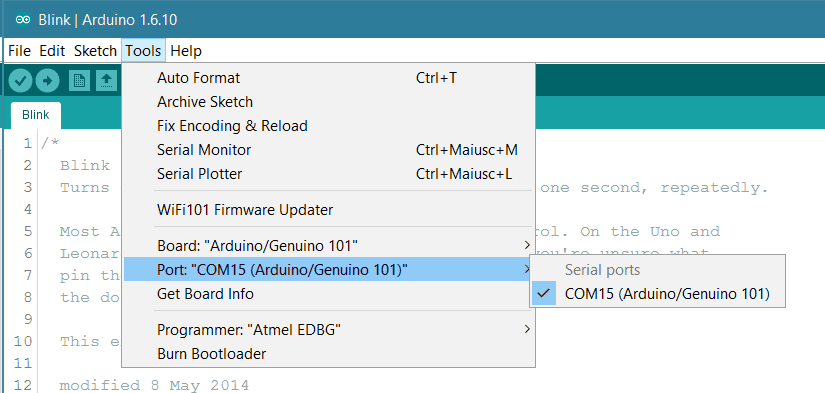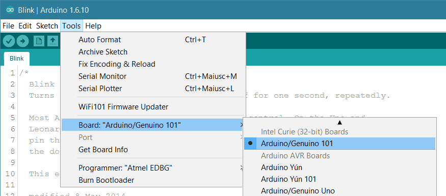 The Arduino 101 is programmed using the Arduino Software (IDE), our Integrated Development Environment common to all our boards and running both online and offline. For more information on how to get started with the Arduino Software visit the Getting Started page.