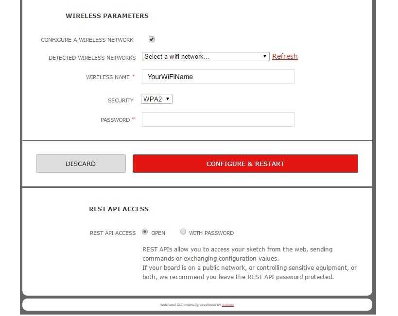 REST is an acronym for "Representational State Transfer". It is a software architecture that exposes various parts of the Arduino hardware through URLs. By default, the REST API access is password protected. It is possible to change this setting to access the services without a password, clicking on Open;