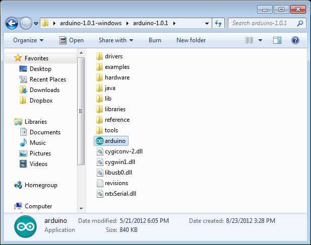 Once the .zip file is extracted to a folder titled something like "arduino - 1.0.x", double-click the folder to open it. Make sure that there are a few files and sub-folders inside it including an arduino.exe file.