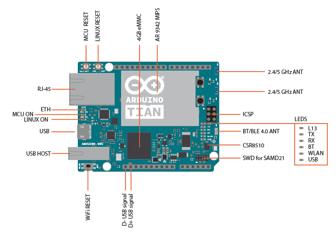 The Arduino Tian is based on the Atheros AR9342 connected to an Atmel Cortex® M0+ 32-bit microcontroller plus all connectivity: Ethernet, Wi-Fi, Bluetooth.